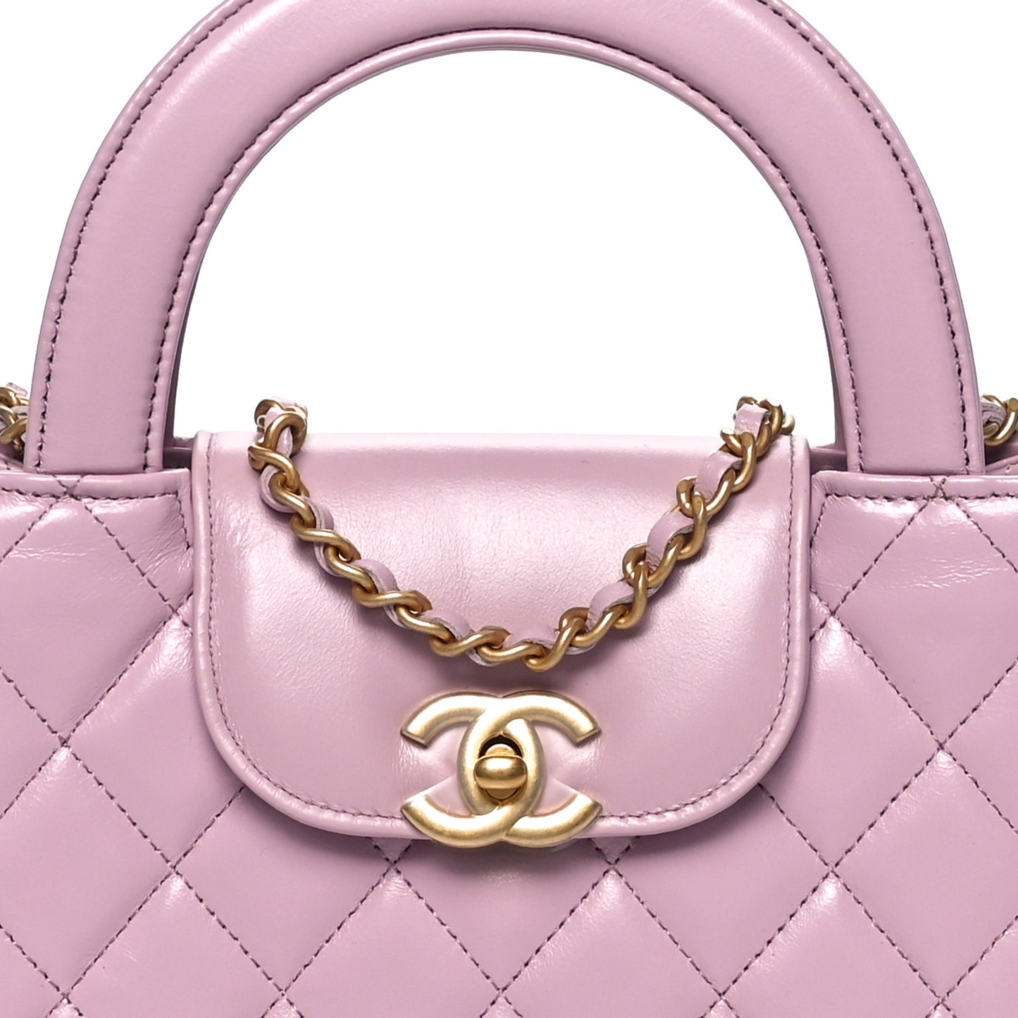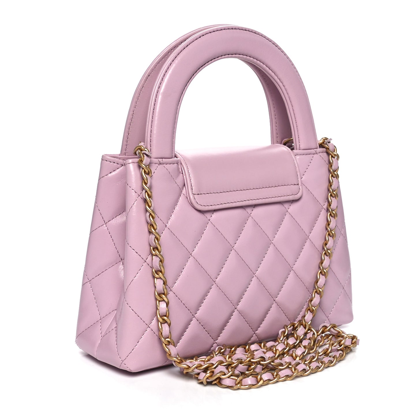 This is an authentic CHANEL Shiny Aged Calfskin Quilted Nano Kelly Shopper in Pink. This mini bag is a twist on an archival Chanel bag, featuring a long crossbody chain strap. This dual top handle bag is quilted in shiny aged calfskin leather in light pink, accented by aged gold hardware, including a Chanel CC turn-lock at the flap. This opens to a compact matching leather interior with zipper and flat pockets.Follow this item for alerts. Chanel is a registered trademark of Chanel. FASHIONPHILE is not affiliated with Chanel.