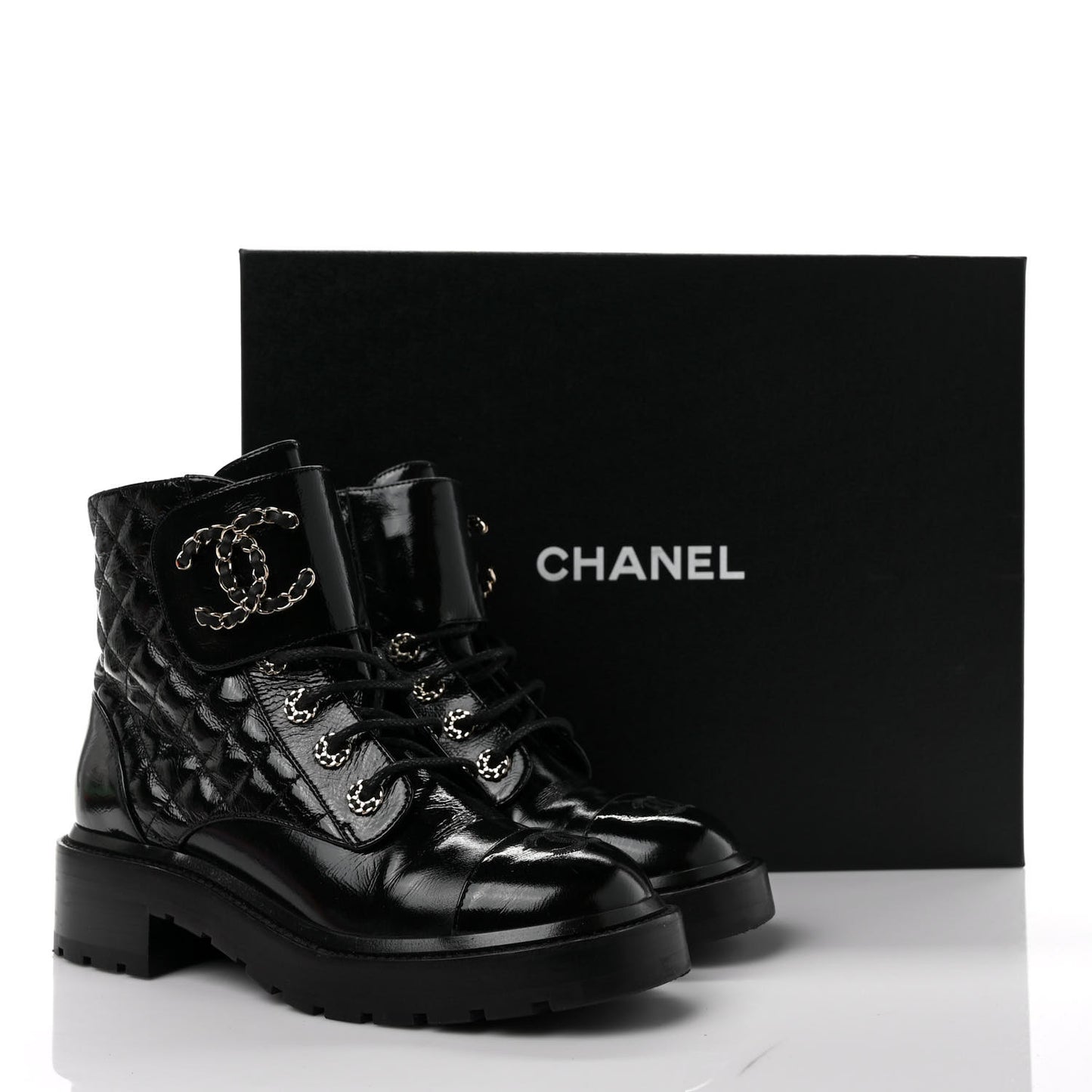 Chanel/ Accessories/ Shoes /Chanel Shiny Calfskin Quilted Lace Up Combat Boots 37.5 Black