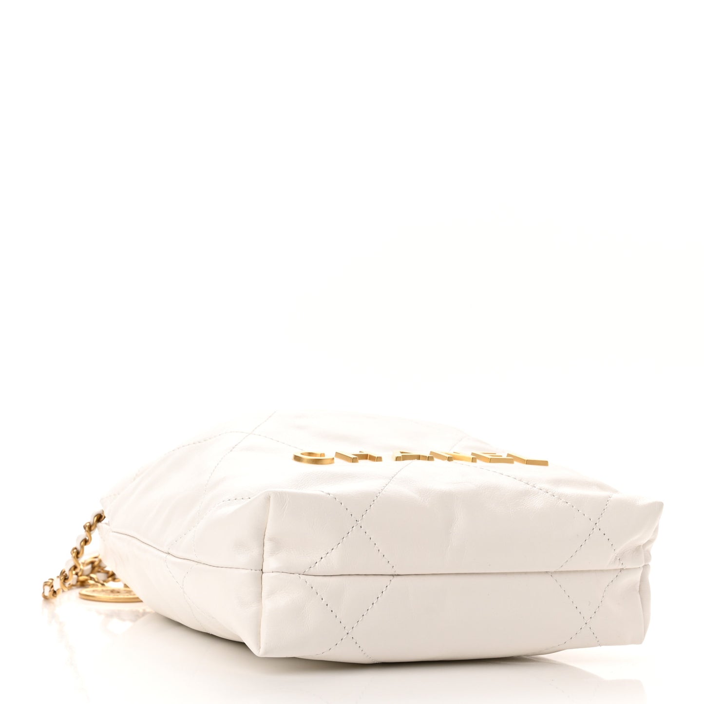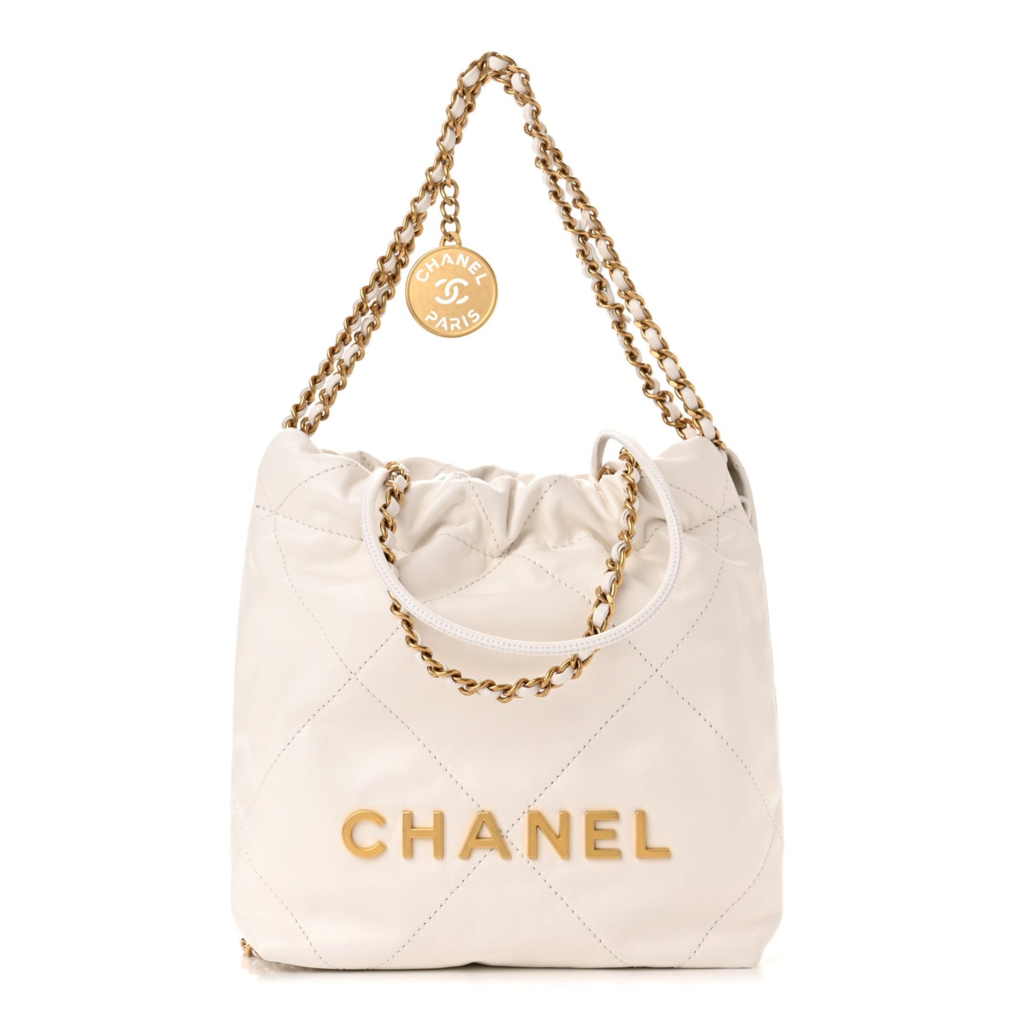 This is an authentic CHANEL Shiny Calfskin Quilted Mini Chanel 22 in White. This chic bag is crafted of calfskin diamond-stitched leather in white. The bag features a leather threaded aged gold chain link shoulder strap joined to a thin leather strap, a leather threaded chain link handle, an aged gold medallion, and the Chanel logo in gold. The bag opens to a beige diamond quilted fabric interior with a leather flat pocket.Follow this item for alerts. Chanel is a registered trademark of Chanel. FASHIONPHILE is not affiliated with Chanel.