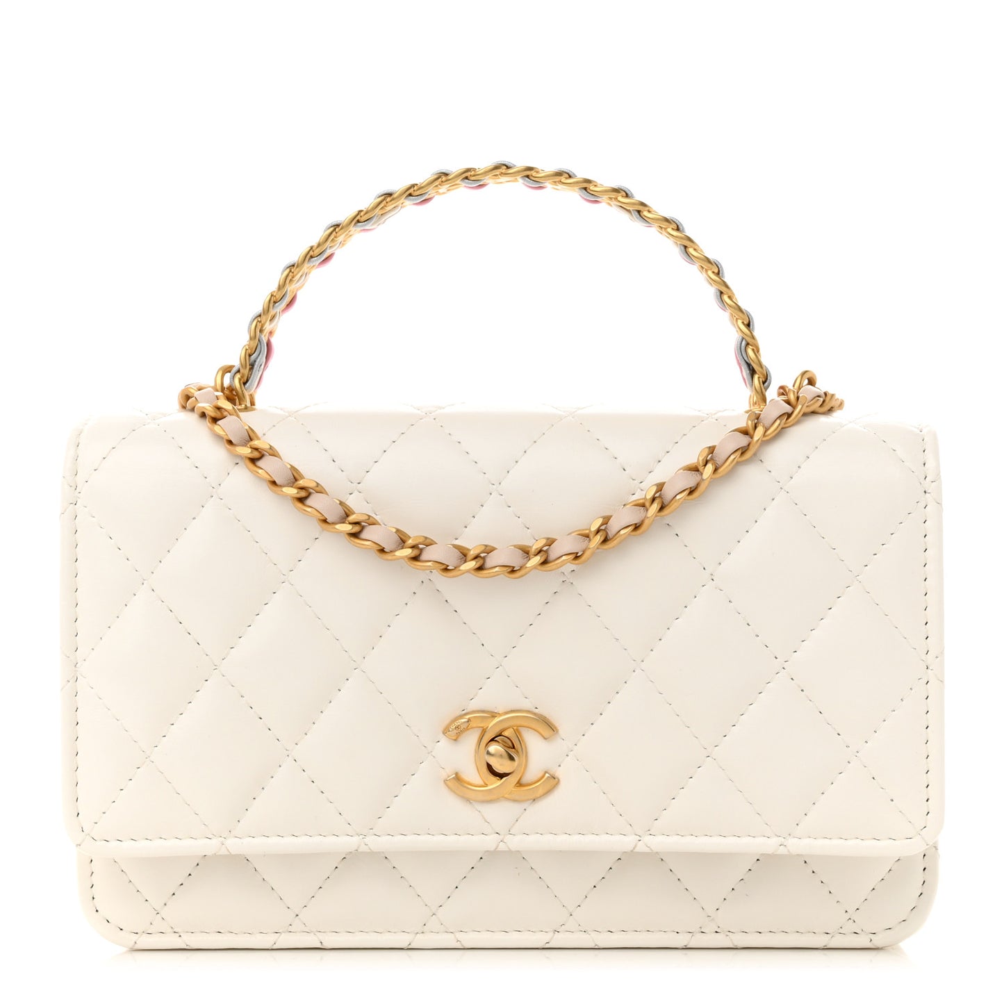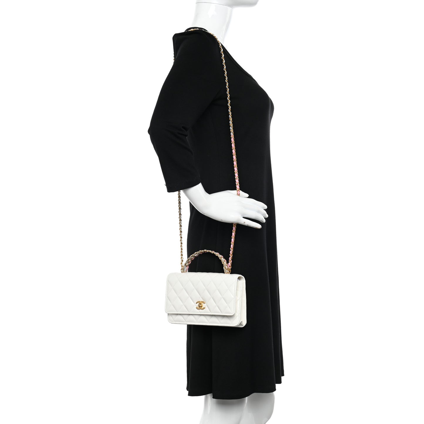This is an authentic CHANEL Shiny Calfskin Quilted Top Handle Wallet On Chain WOC in White. This stylish wallet is crafted of luxurious diamond quilted calfskin leather in White. This shoulder bag features a multicolor leather threaded chain top handle, a leather threaded aged gold chain-link crossbody strap, and a matching gold Chanel CC turn lock on the facing flap. The bag opens to a fabric and leather interior with a zipped compartment, card slots, and pockets.Follow this item for alerts. Chanel is a registered trademark of Chanel. FASHIONPHILE is not affiliated with Chanel.