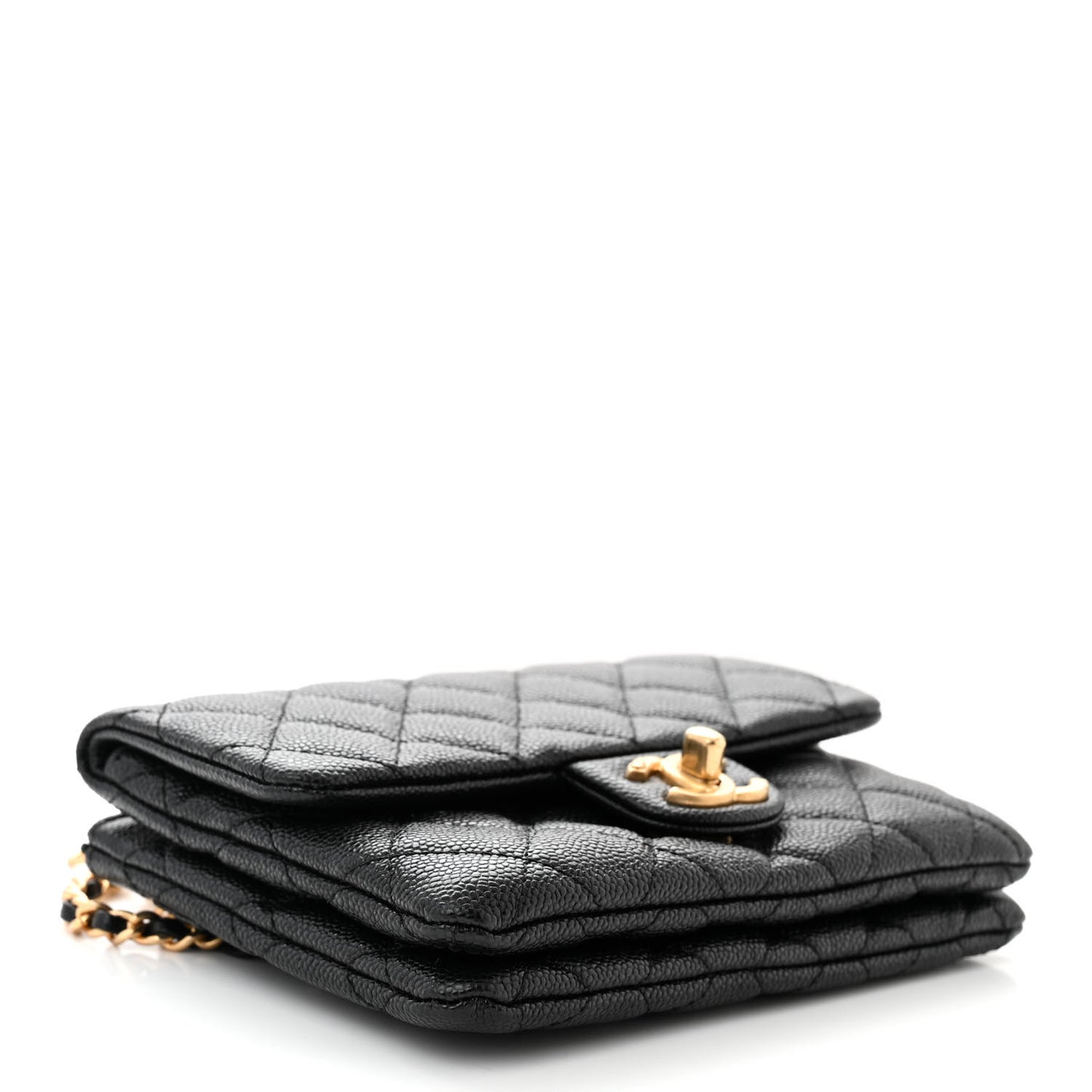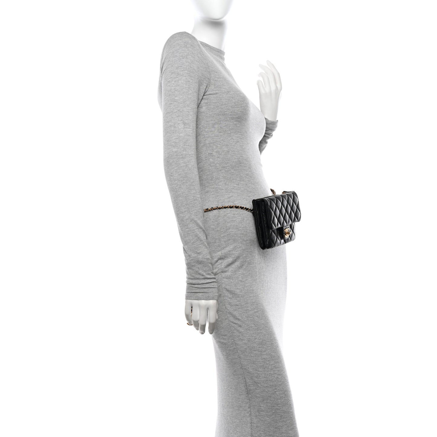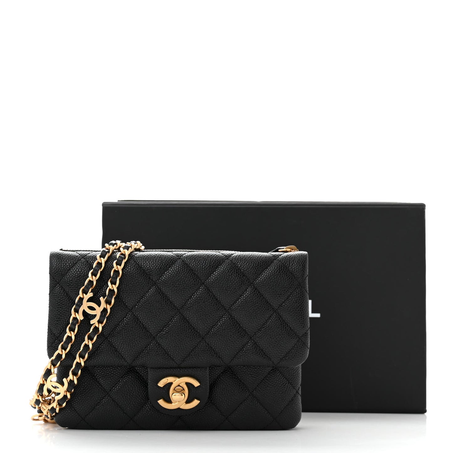 This is an authentic CHANEL Shiny Caviar Pick Me Up Flap Belt Bag in Black. This waist bag is crafted of diamond quilted grained shiny calfskin in black. The bag features a rear zipper pocket, and a leather threaded aged gold adjustable chain waist strap. The top flap opens with a Chanel CC turn lock to a matching black leather interior.Follow this item for alerts. Chanel is a registered trademark of Chanel. FASHIONPHILE is not affiliated with Chanel.