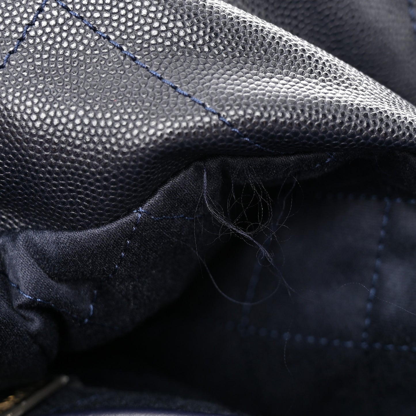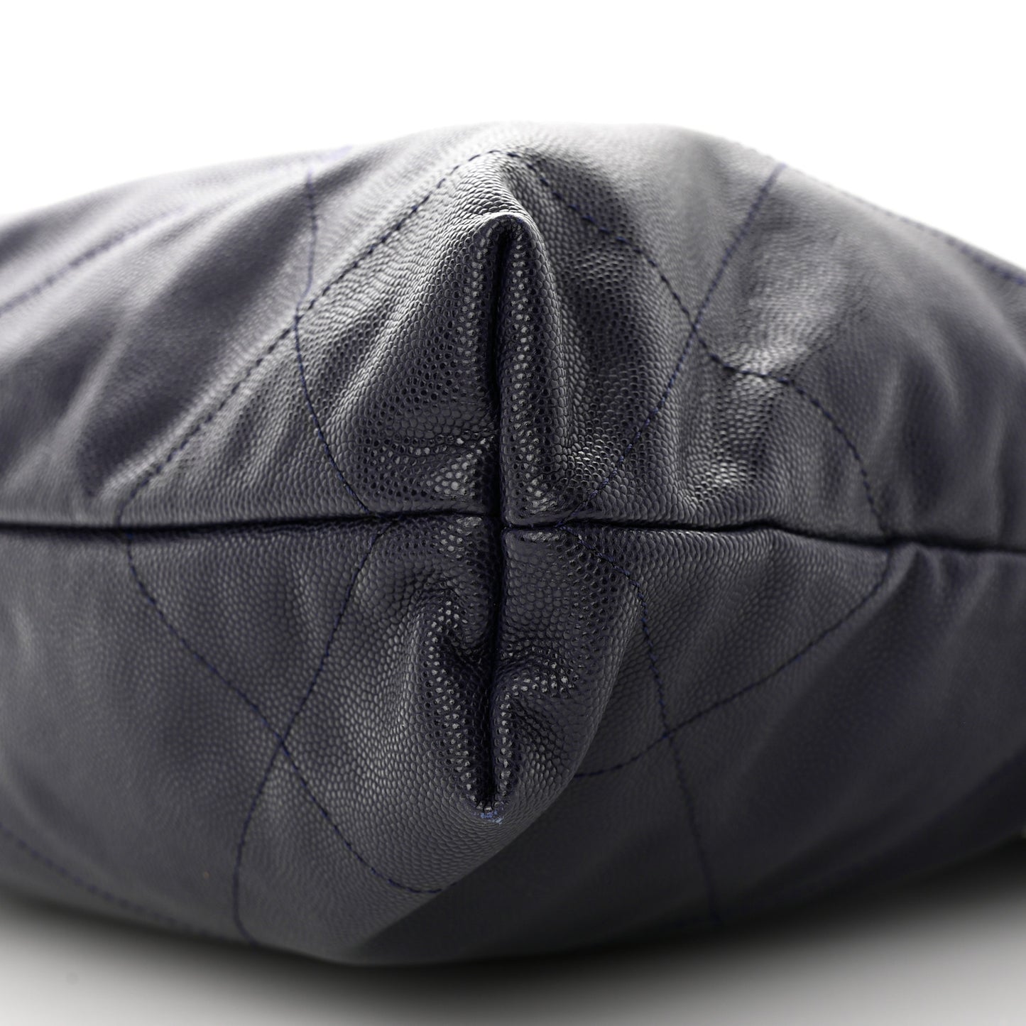 This is an authentic CHANEL Shiny Caviar Quilted Chanel 22 in Dark Blue. This drawstring bag is crafted of textured aged and shiny diamond-stitched leather in dark blue. This shoulder bag features a gold chain leather threaded shoulder strap, a Chanel medallion, and the Chanel name across the front. The bag is open to a navy blue diamond quilted fabric interior with a zipper pocket and matching removable pouch.Follow this item for alerts. Chanel is a registered trademark of Chanel. FASHIONPHILE is not affiliated with Chanel.