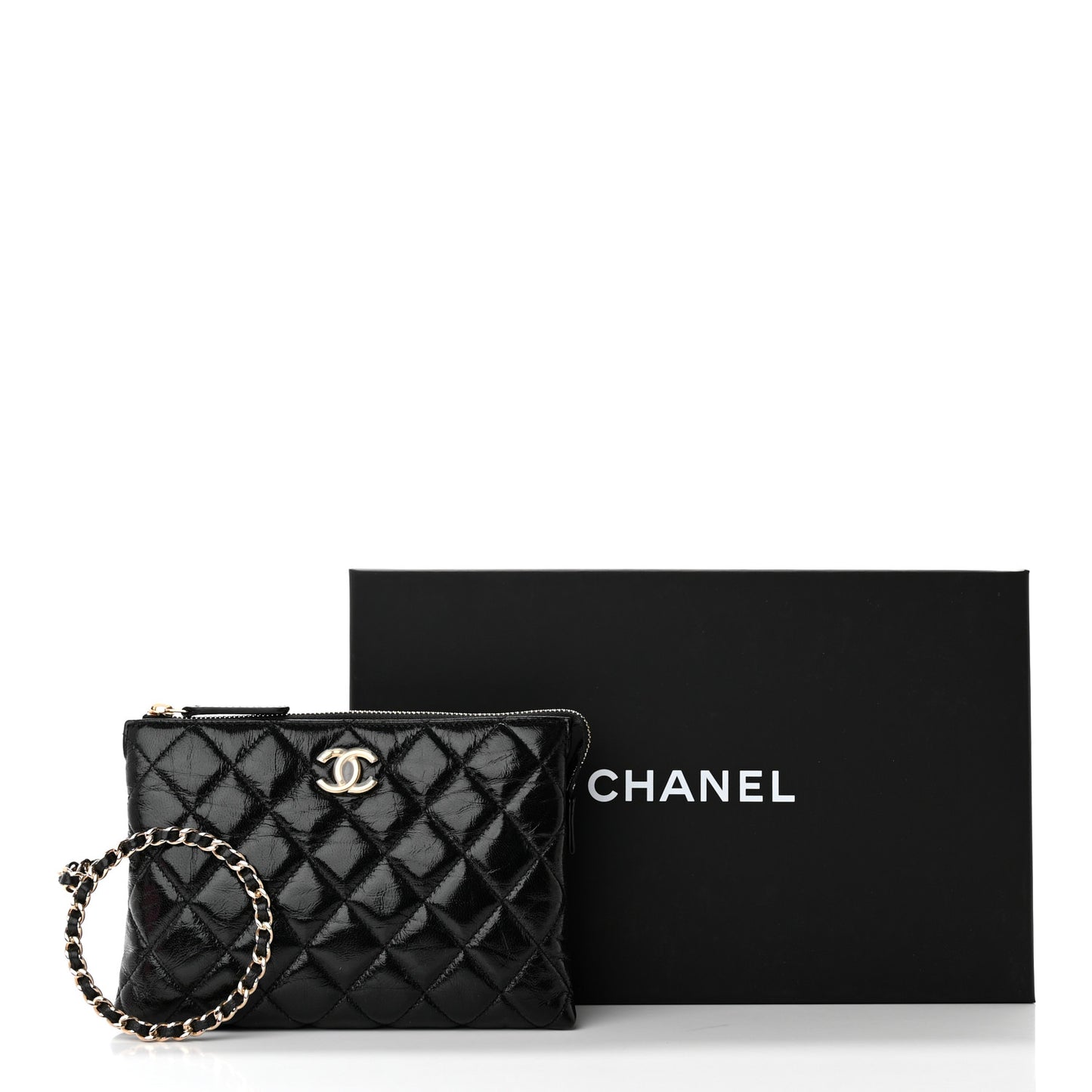 This is an authentic CHANEL Shiny Crumpled Calfskin Quilted Clutch Bag in Black. This chic and stylish flap wristlet is crafted of luxurious shiny crumpled quilted lambskin leather in black. This crossbody bag features an aged gold chain link leather threaded wristlet strap with a round hand hole and a gold Chanel CC logo. The top zipper opens the bag to a partitioned black fabric interior with card slots.