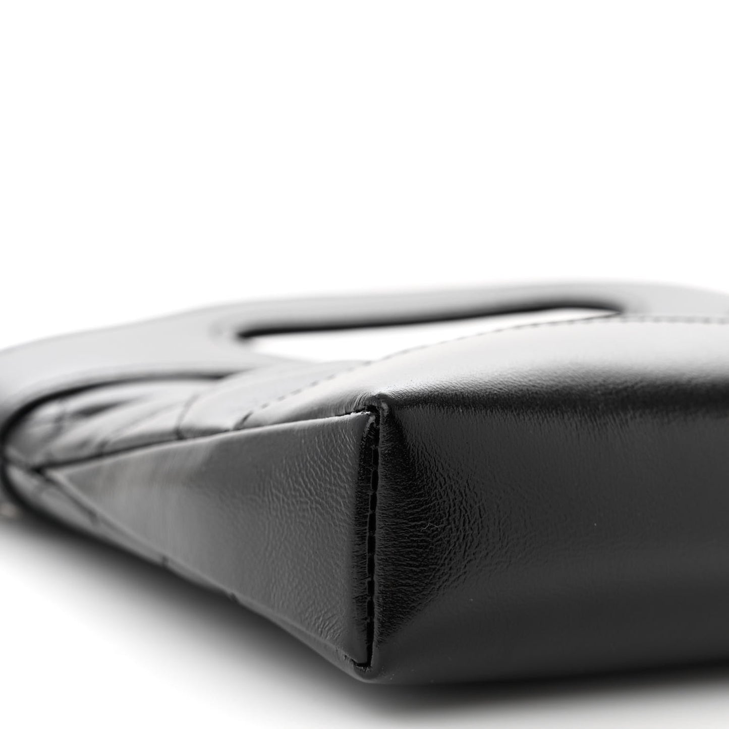 This is an authentic CHANEL Shiny Crumpled Calfskin Quilted Nano 31 Shopping Bag in Black. This stylish bag is crafted of padded diamond quilted lambskin leather in black with smooth leather trim in black. The bag features black handles, a long black rolled shoulder strap, and a gold Chanel CC turn lock. The top is open to a black fabric interior with zipper pockets.