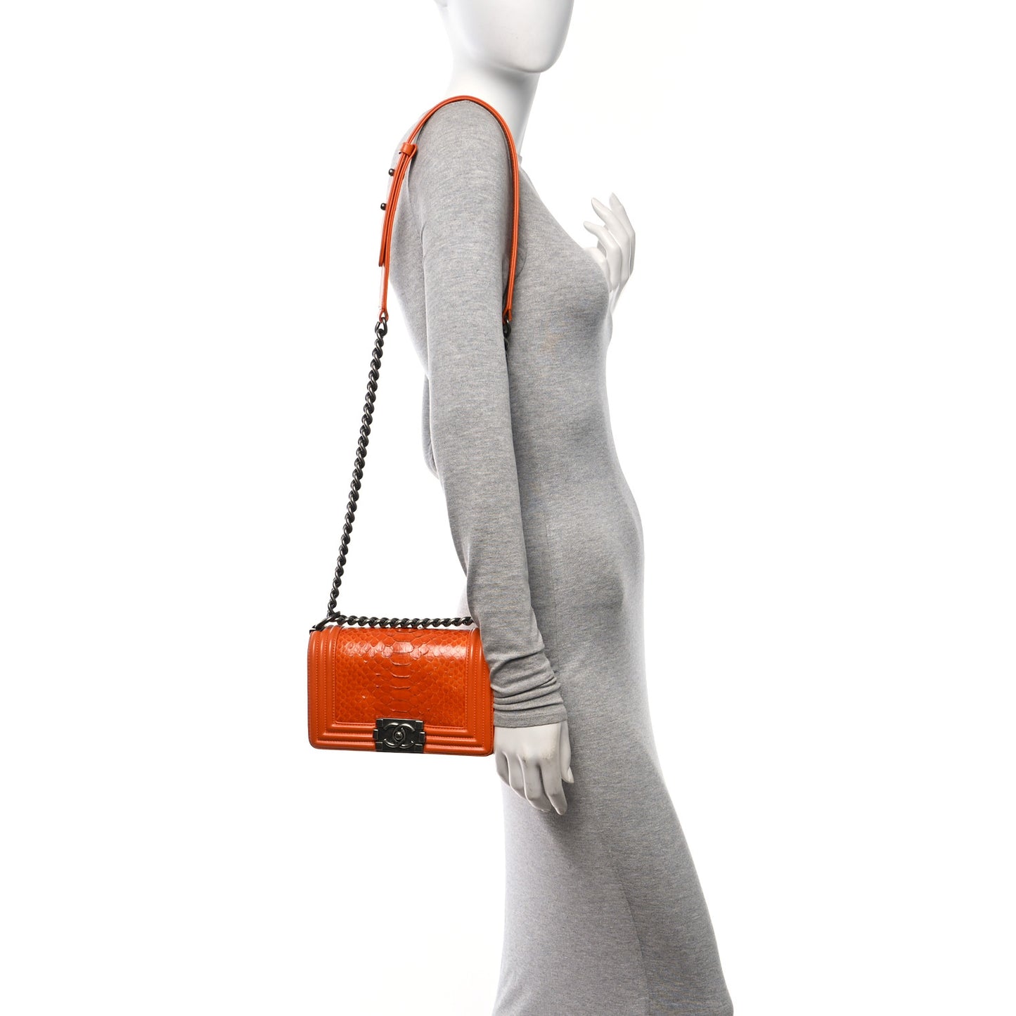 This is an authentic CHANEL Snakeskin Small Boy Flap in Orange. This chic shoulder bag is crafted of snakeskin and linear calfskin quilting around the sides. The bag features a thick aged silver chain shoulder strap with a leather shoulder pad and a unique facing squared matching Boy press lock. This opens the front flap to a matching leather interior with a patch pocket.Follow this item for alerts. Chanel is a registered trademark of Chanel. FASHIONPHILE is not affiliated with Chanel.