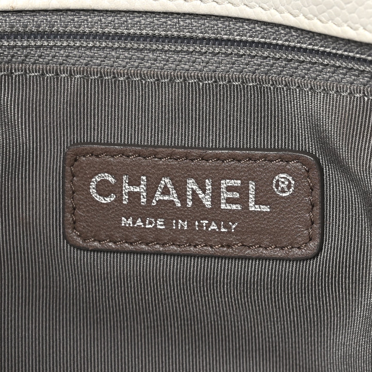 This is an authentic CHANEL Soft Caviar Quilted CC Timeless Tote in White. This stunning tote is crafted of diamond quilted white caviar leather. The bag features a large stitched Chanel CC quilted logo and strap top handles with large silver links. The top is open to a partitioned grey fabric interior with a zipper compartment and pockets.Follow this item for alerts. Chanel is a registered trademark of Chanel. FASHIONPHILE is not affiliated with Chanel.