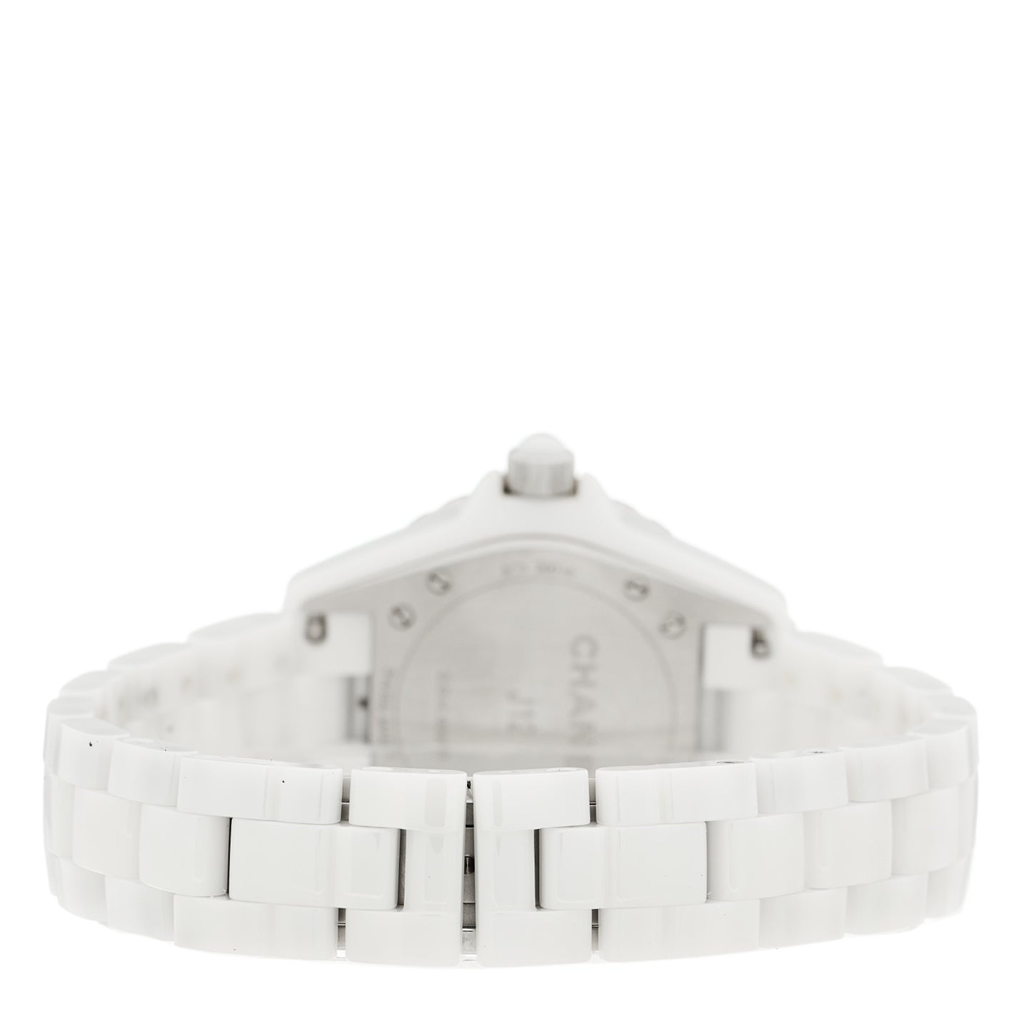 This is an authentic CHANEL Stainless Steel Ceramic Diamond 33mm J12 Quartz Watch in White. The watch is crafted of stainless and white ceramic and features a white dial with diamond hour markers, a date window, sapphire crystal, and a quartz movement.Follow this item for alerts. Chanel is a registered trademark of Chanel. FASHIONPHILE is not affiliated with Chanel.