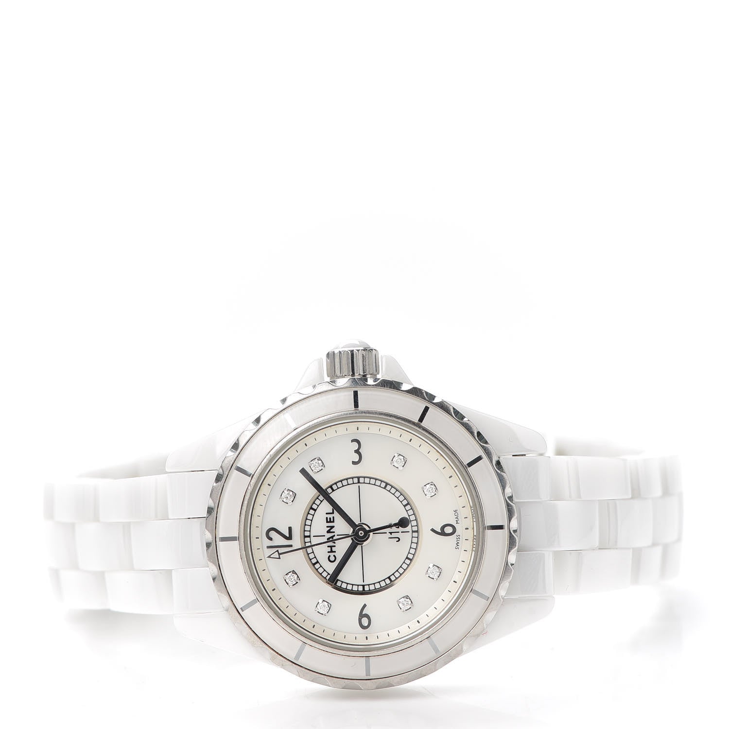 This is an authentic CHANEL Stainless Steel Ceramic Diamond Mother of Pearl 29mm J12 Quartz Watch White. The watch is crafted of white ceramic and stainless steel and features a white mother of pearl dial with 8 diamond hour markers, white stationary bezel, sapphire crystal, double deployment clasp, and a Swiss quartz movement.Follow this item for alerts. Chanel is a registered trademark of Chanel. FASHIONPHILE is not affiliated with Chanel.