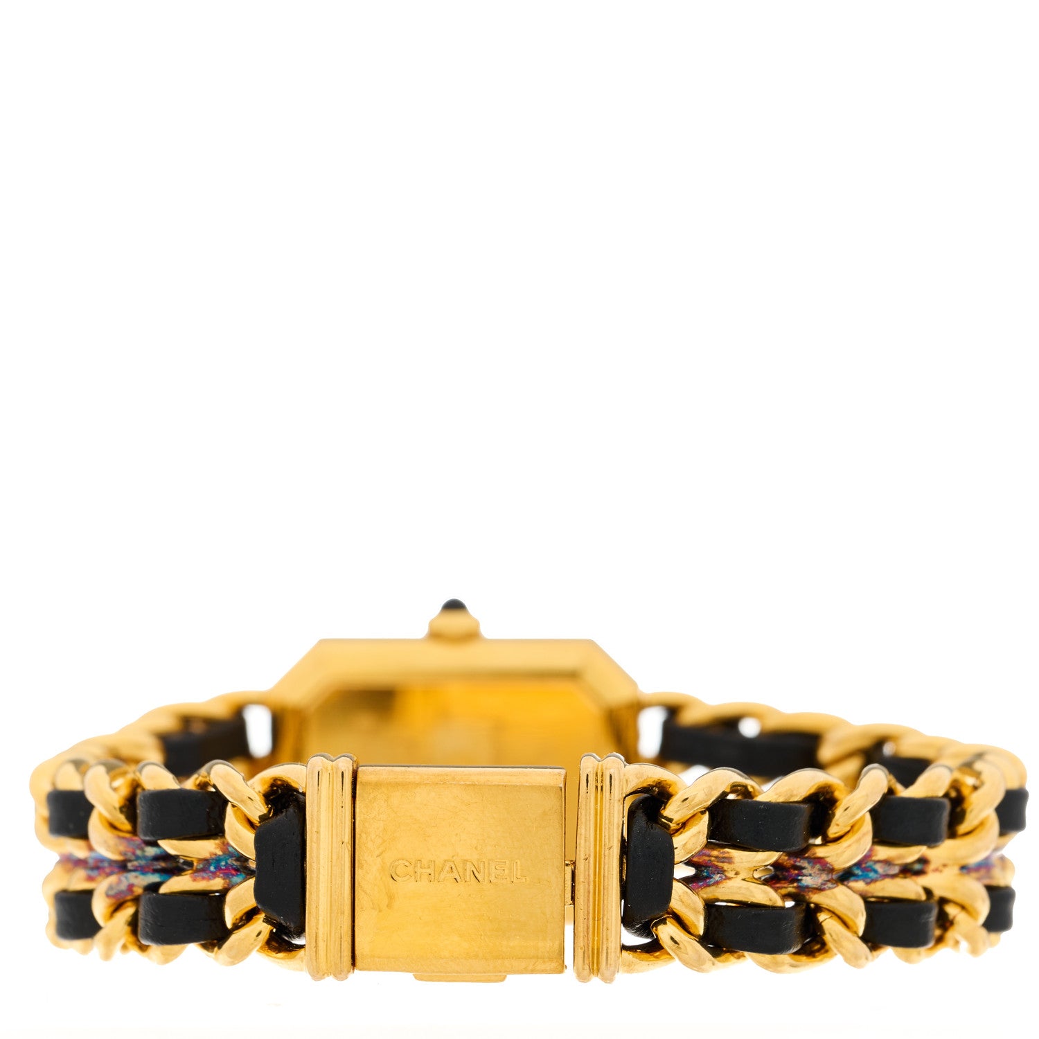 This is an authentic CHANEL Stainless Steel Lambskin 20mm Chain Premiere Quartz Watch Gold L. The watch is crafted of gold-toned stainless steel and features a black dial, gold hands, sapphire crystal, black leather-threaded gold chain-link band, and a quartz movement.Follow this item for alerts. Chanel is a registered trademark of Chanel. FASHIONPHILE is not affiliated with Chanel.