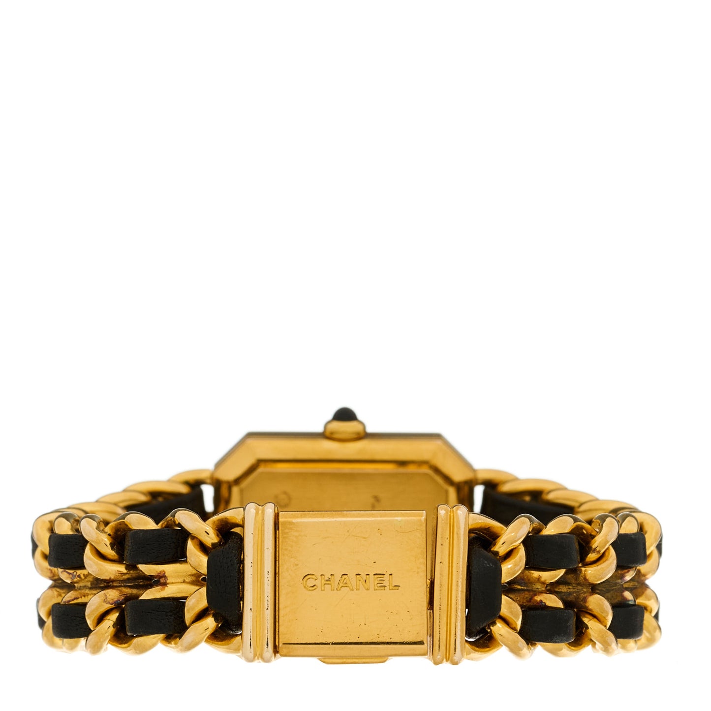 This is an authentic CHANEL Stainless Steel Lambskin 20mm Chain Premiere Quartz Watch Gold M. The watch is crafted of gold-toned stainless steel and features a black dial, gold hands, sapphire crystal, black leather-threaded gold chain-link band, and a quartz movement.Follow this item for alerts. Chanel is a registered trademark of Chanel. FASHIONPHILE is not affiliated with Chanel.