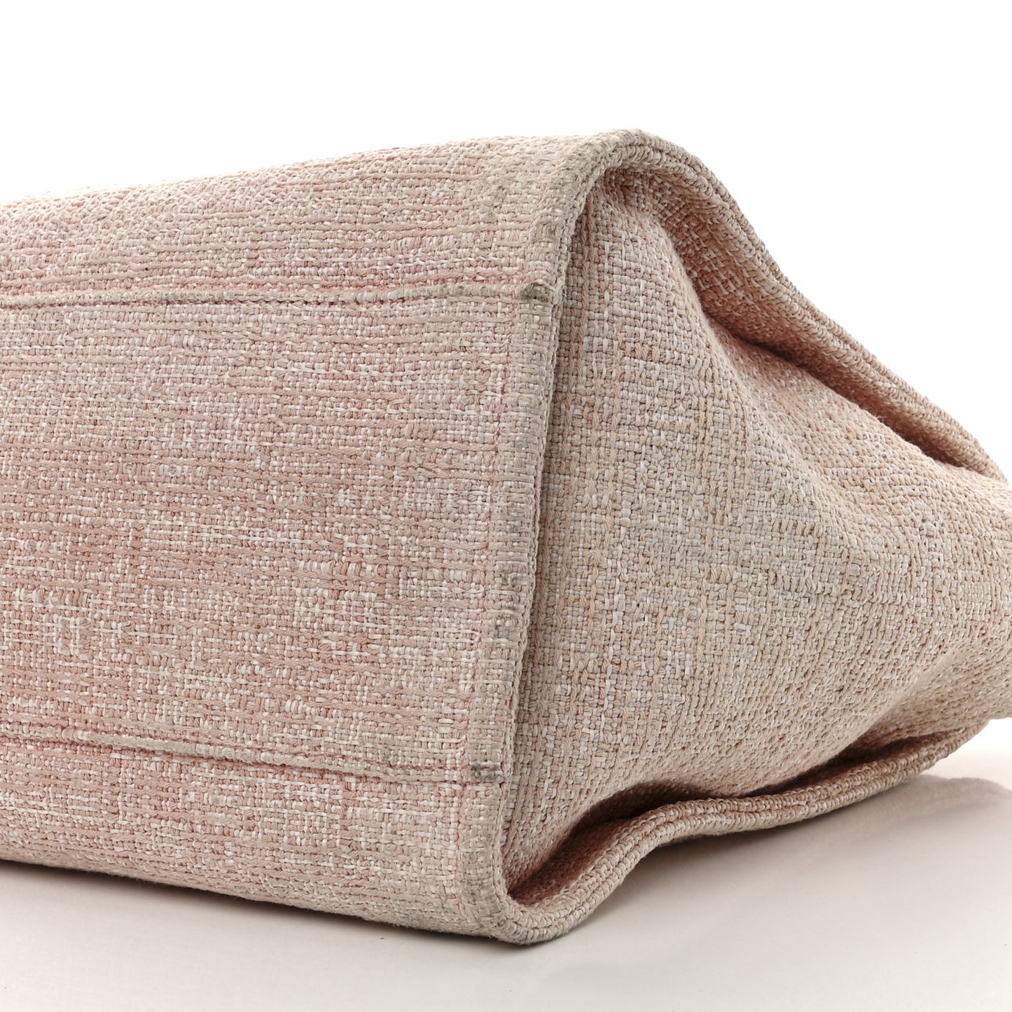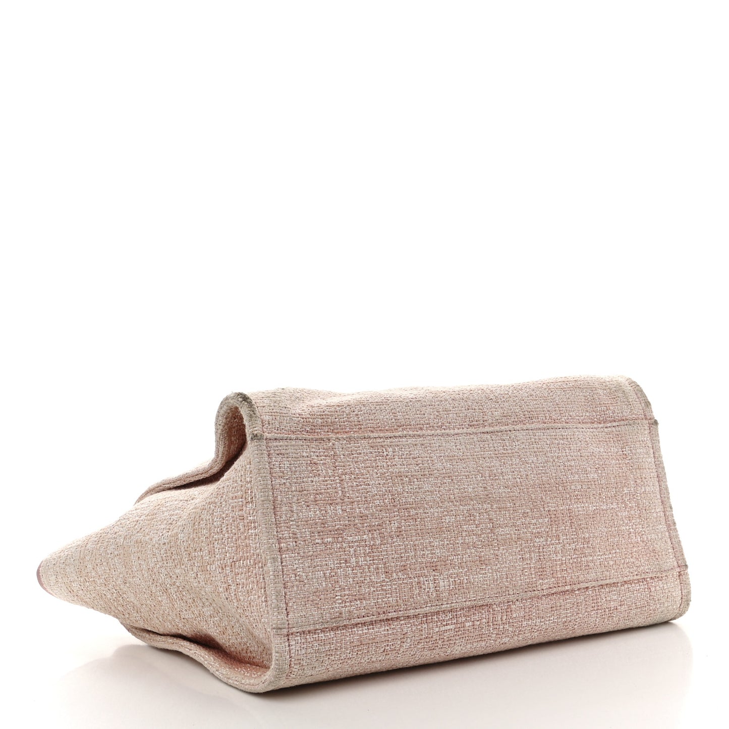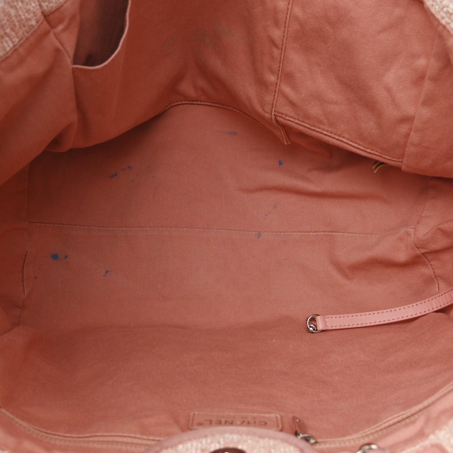 This is an authentic CHANEL Straw Lurex Large Deauville Tote in Pink. This lovely tote is crafted of a fine pink woven straw raffia with a glittery Chanel advertisement logo on the front. The shoulder bag features rolled pink leather top handles and polished silver chain-link grosgrain fabric threaded shoulder straps. The broad top is open to a pink fabric interior with zipper and patch pockets.Follow this item for alerts. Chanel is a registered trademark of Chanel. FASHIONPHILE is not affiliated with Chanel.