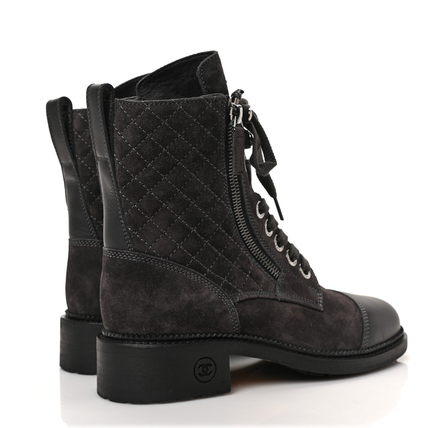 Chanel/ Accessories/ Shoes /Chanel Suede Calfskin Quilted Lace Up Boots 36.5 Grey