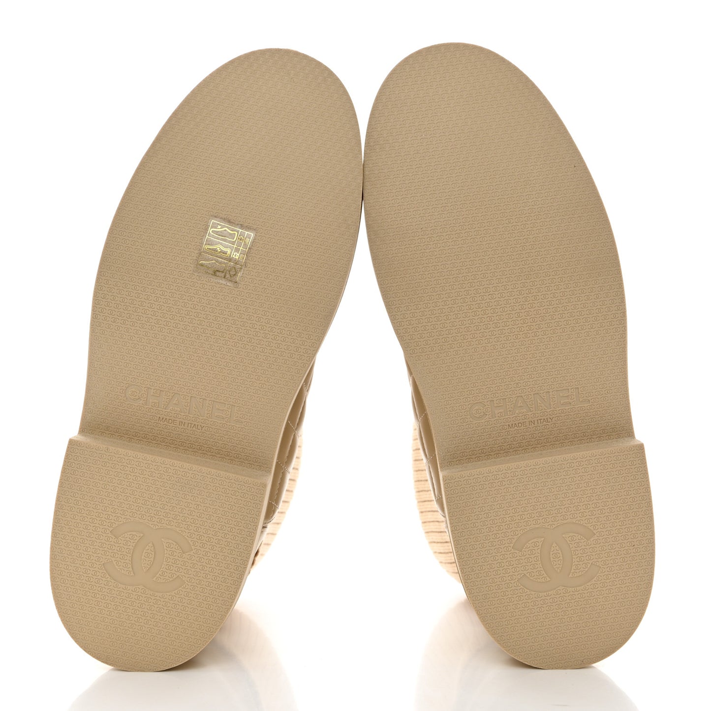 This is an authentic pair of CHANEL Suede Lambskin Calfskin Knit Womens Ankle Boots size 38 in Beige. These warm winter boots are crafted of luxurious lambskin leather, with a diamond quilted vamp, suede leather, and ribbed fabric all in beige. They feature a 1.25-inch foam platform sole and a stitched CC logo on the toe.Follow this item for alerts. Chanel is a registered trademark of Chanel. FASHIONPHILE is not affiliated with Chanel.