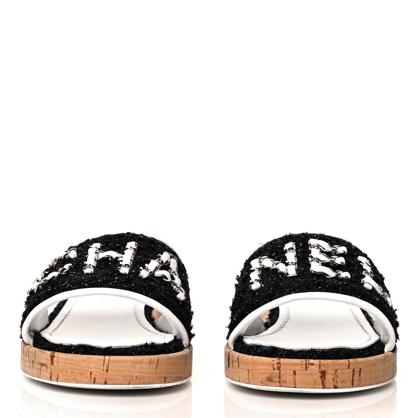 Chanel/ Accessories/ Shoes /Chanel Tweed Cork CC Chain Mule Sandal 36 Black