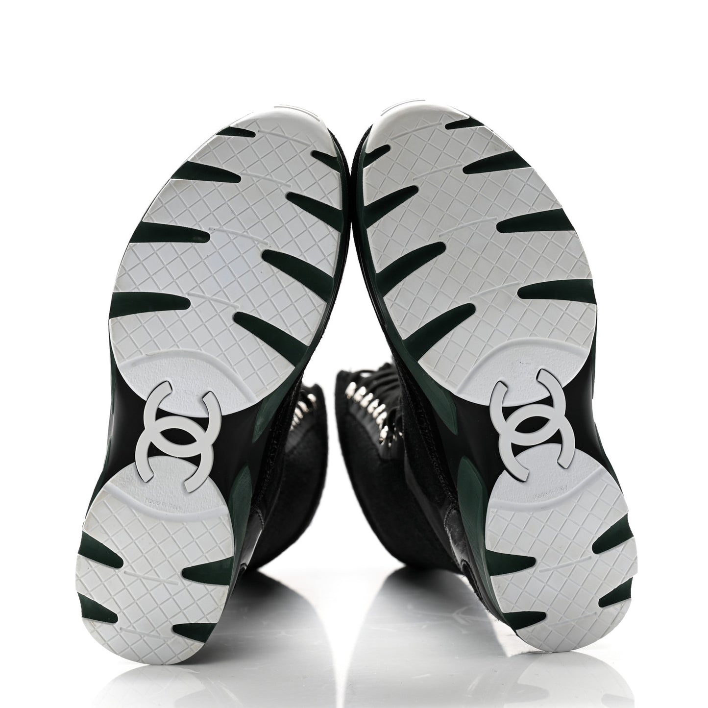 This is an authentic pair of CHANEL Tweed Patent Calfskin Sneaker High Boots Size 38.5 in Black. These lace-up black tweed boots feature a sneaker with a green rubber bottom trim, patent leather trim, and silver eyelets.Follow this item for alerts. Chanel is a registered trademark of Chanel. FASHIONPHILE is not affiliated with Chanel.