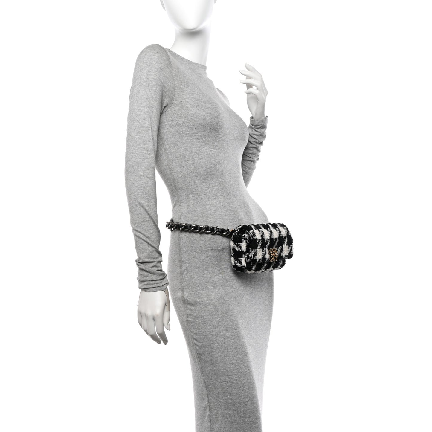 This is an authentic CHANEL Tweed Quilted Chanel 19 Waist Bag in Black, Ecru and White. This stylish waist bag is finely crafted of a black and white tweed material. The bag features a black belt, a front flap, and a aged gold CC turn lock. This opens to a black fabric interior with a patch pocket.Follow this item for alerts. Chanel is a registered trademark of Chanel. FASHIONPHILE is not affiliated with Chanel.
