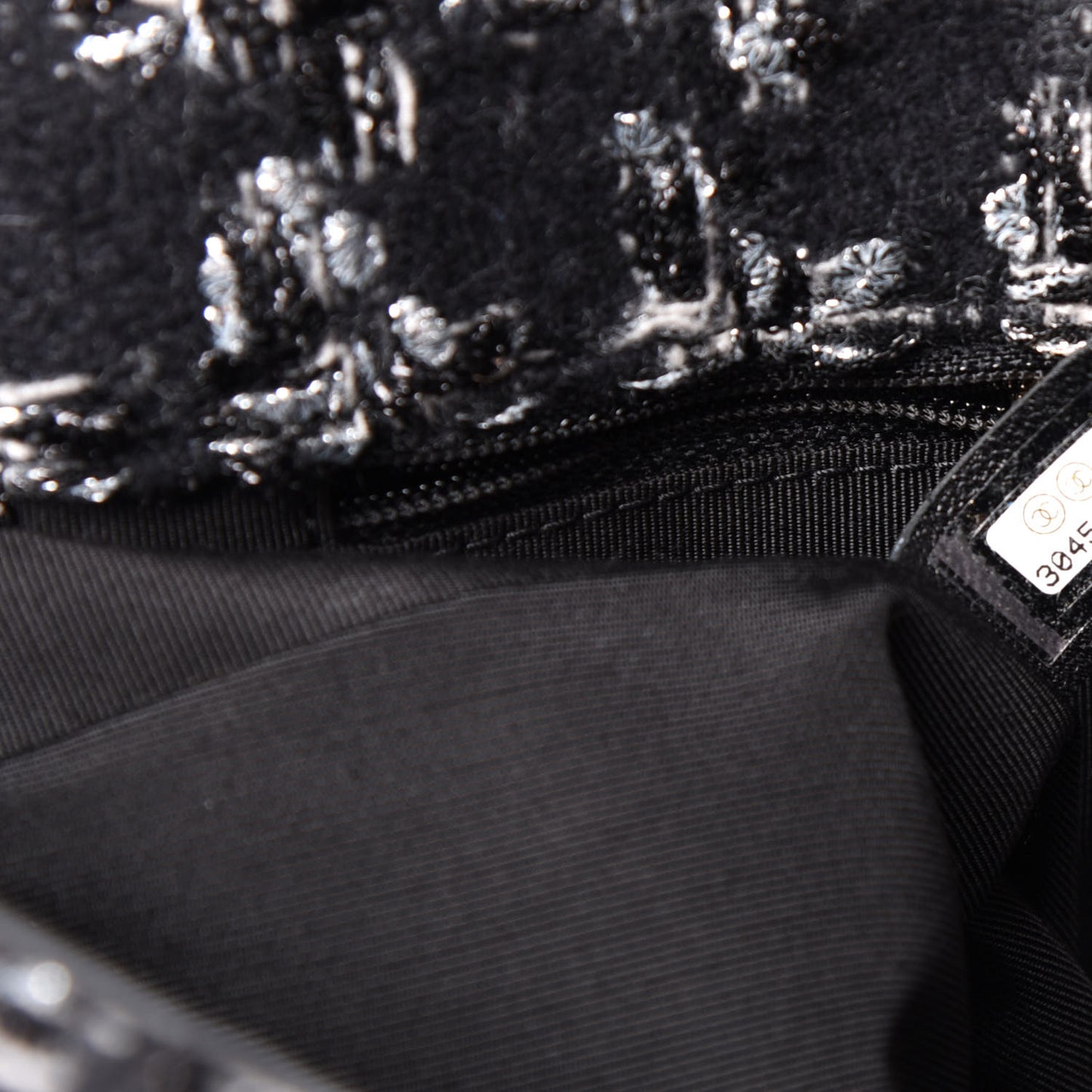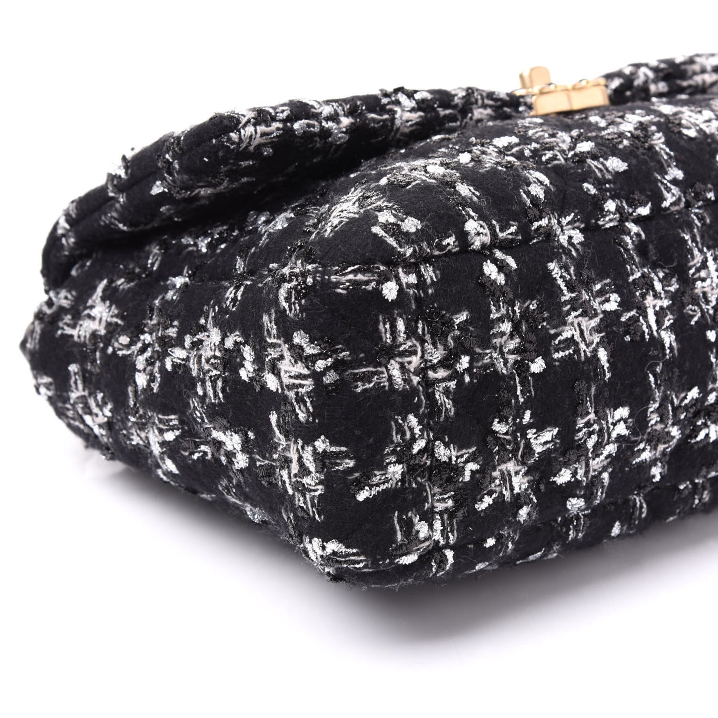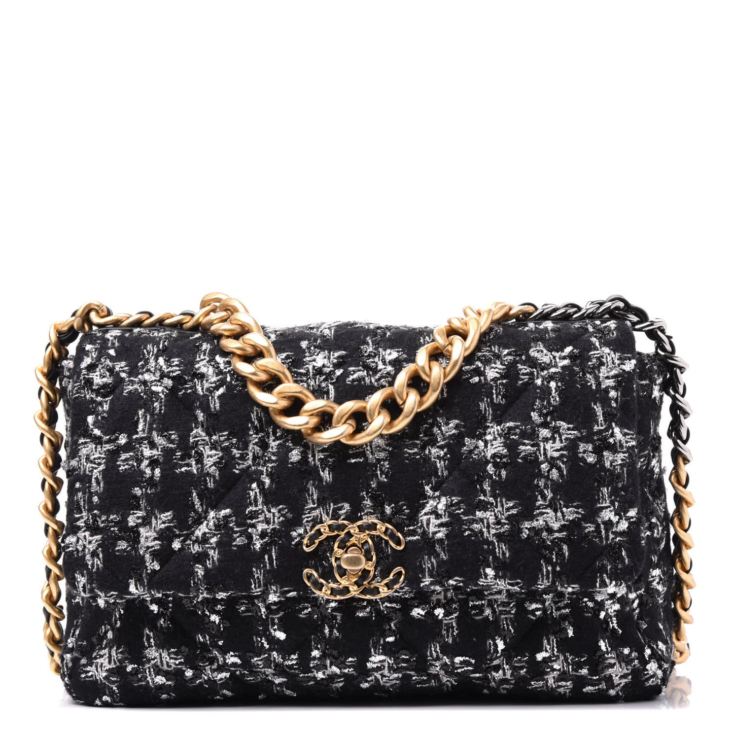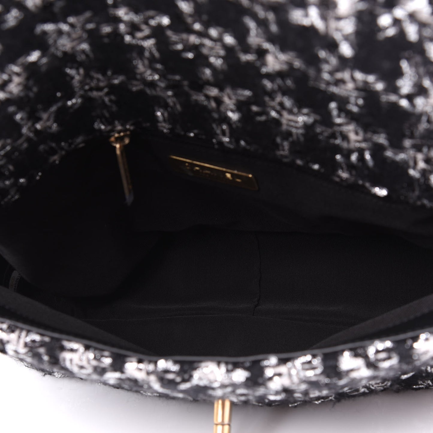 This is an authentic CHANEL Tweed Quilted Large Chanel 19 Flap in Black and Ecru White. This chic shoulder bag is crafted of black and white tweed with a white and silver weaved details. The refined bag features an aged gold chain detail CC turn-lock on the flap, a magnetic snap pocket at the rear, and a leather threaded gradient gold to ruthenium chain-link strap with a leather shoulder pad. The front flap opens to a black fabric interior with a zipper pocket. This versatile bag with soft leather is an essential bag for any Chanel aficionado.Follow this item for alerts. Chanel is a registered trademark of Chanel. FASHIONPHILE is not affiliated with Chanel.