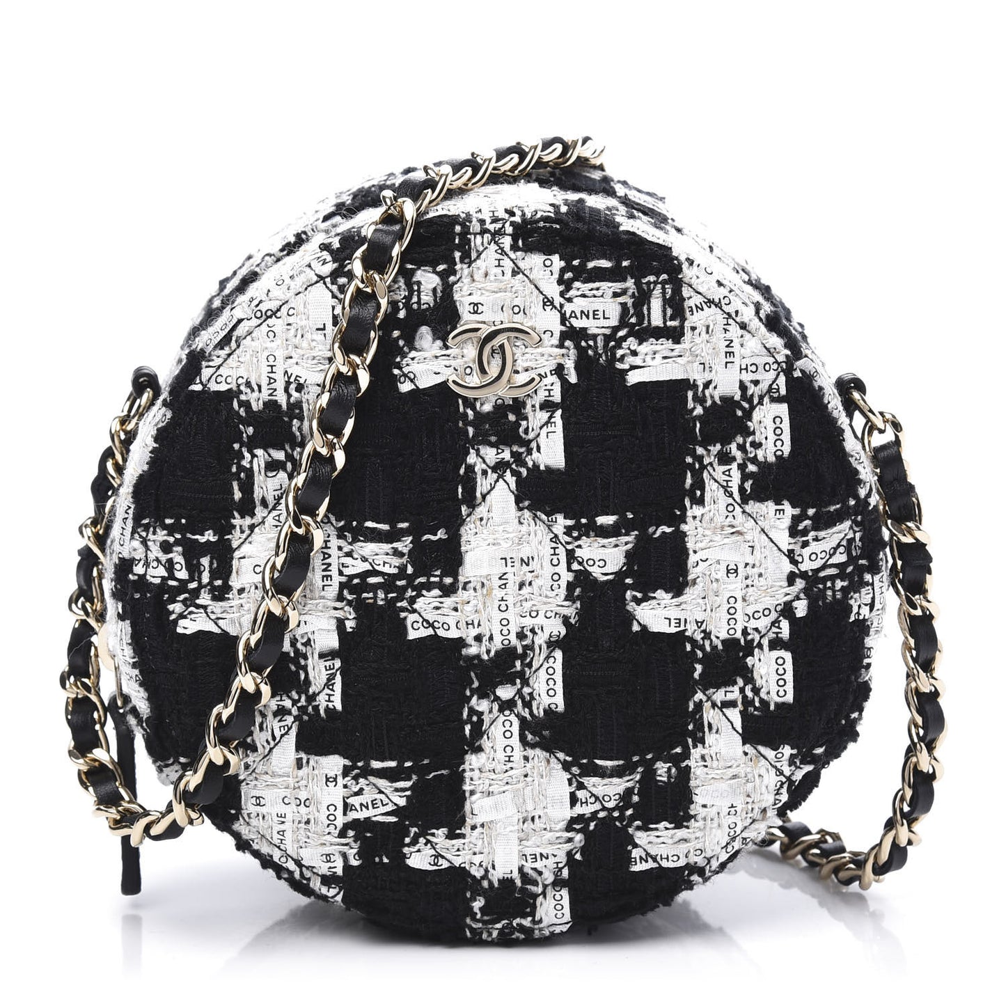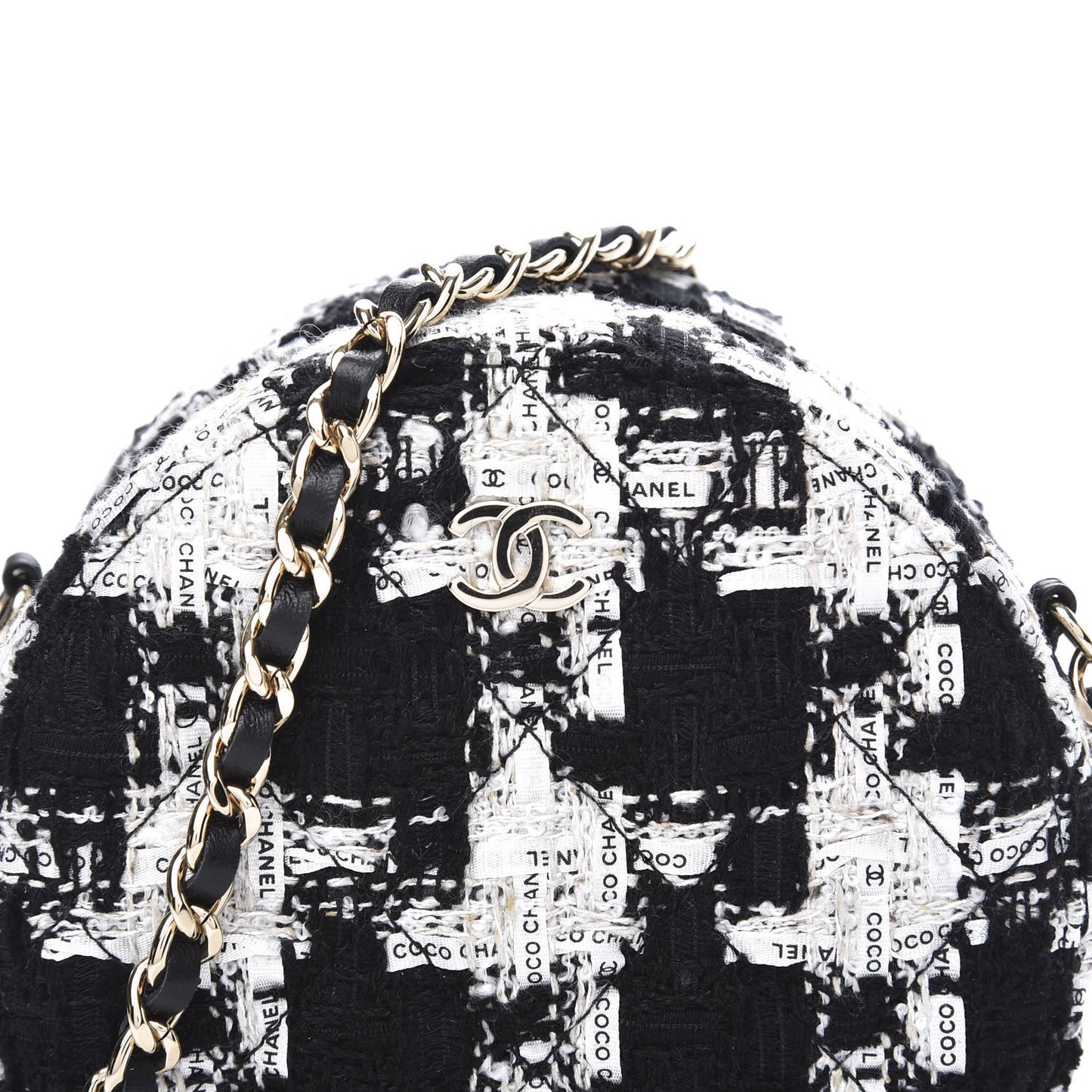 Tweed Quilted Round Clutch With Chain Black Ecru White