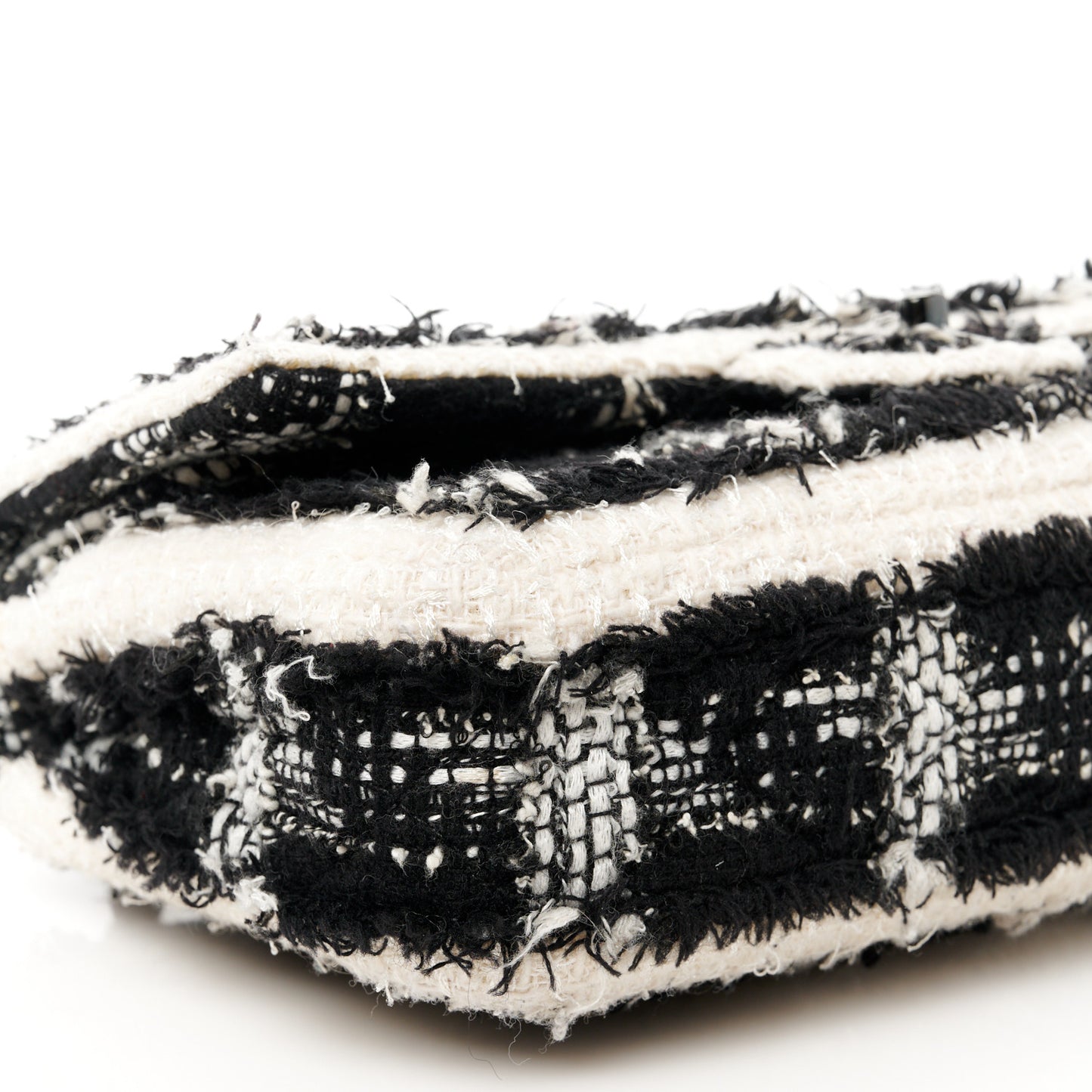 This is an authentic CHANEL Tweed Quilted Tartan Medium Double Flap in Black and White. This bold shoulder bag is composed of squared black and white tweed. The handbag features matching tweed threaded shoulder straps and a facing black Chanel CC turn lock for the facing flap. This opens to an inner flat and a black leather interior with patch pockets and a front pocket.Follow this item for alerts. Chanel is a registered trademark of Chanel. FASHIONPHILE is not affiliated with Chanel.