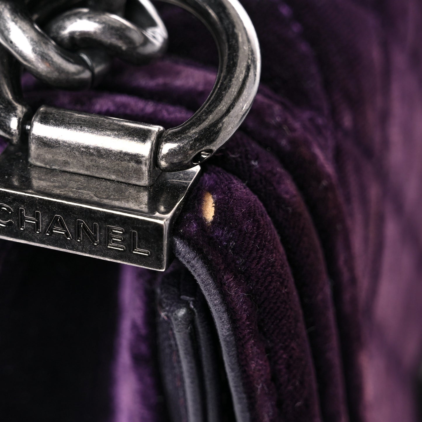 This is an authentic CHANEL Velvet Quilted Small Boy Flap in Purple. This chic shoulder bag is crafted of luxurious velvet in diamond-shaped quilting with stitching that frames the flap edges. The bag features a ruthenium chain shoulder strap with a leather shoulder pad, and a boy CC push lock. The flap opens to a fabric interior with a flat pocket.Follow this item for alerts. Chanel is a registered trademark of Chanel. FASHIONPHILE is not affiliated with Chanel.