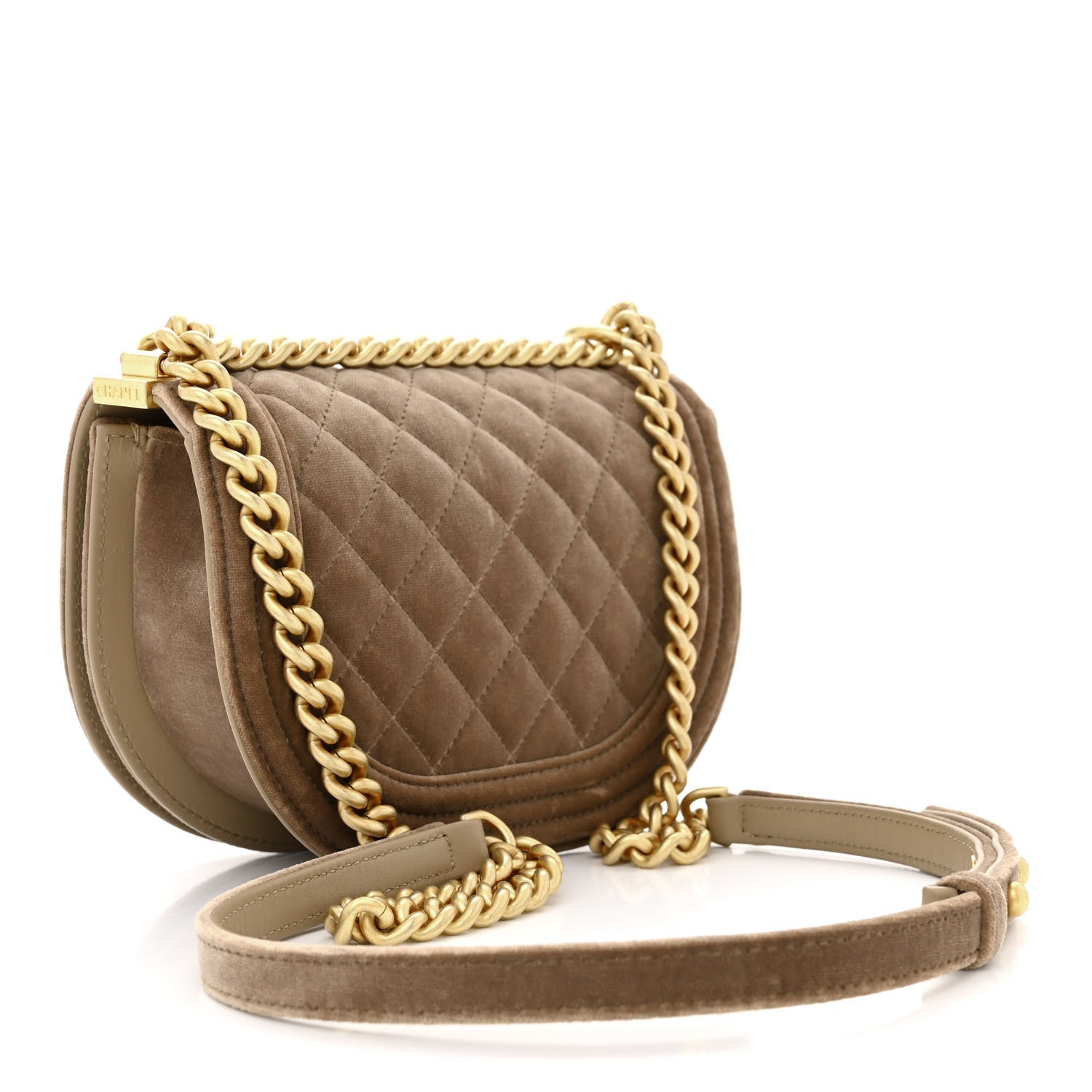 This is an authentic CHANEL Velvet Quilted Small Boy Messenger Bag Beige. This classic shoulder bag is crafted of velvet in beige. This bag features a aged gold chain strap with a velvet and leather shoulder pad. The front flap has a aged gold CC turn lock that opens to a matching leather interior with a patch pocket.Follow this item for alerts. Chanel is a registered trademark of Chanel. FASHIONPHILE is not affiliated with Chanel.