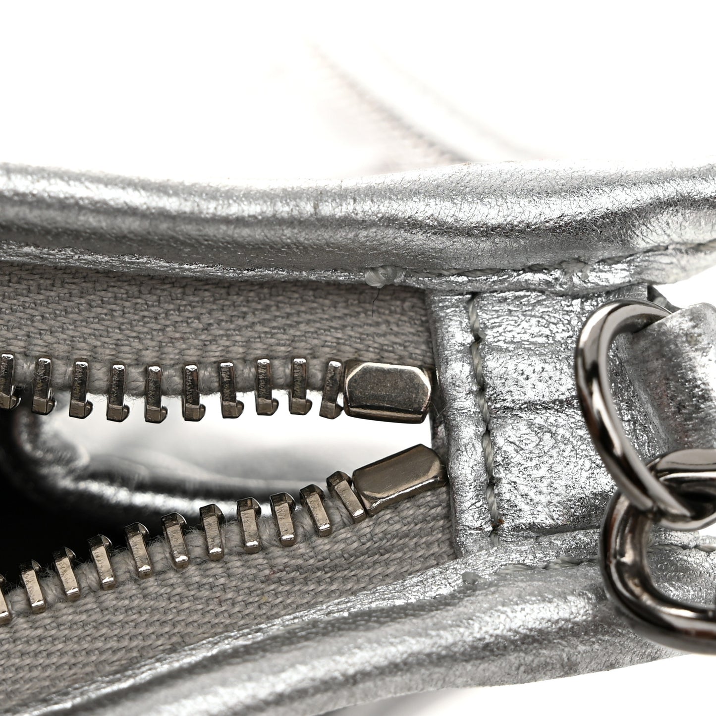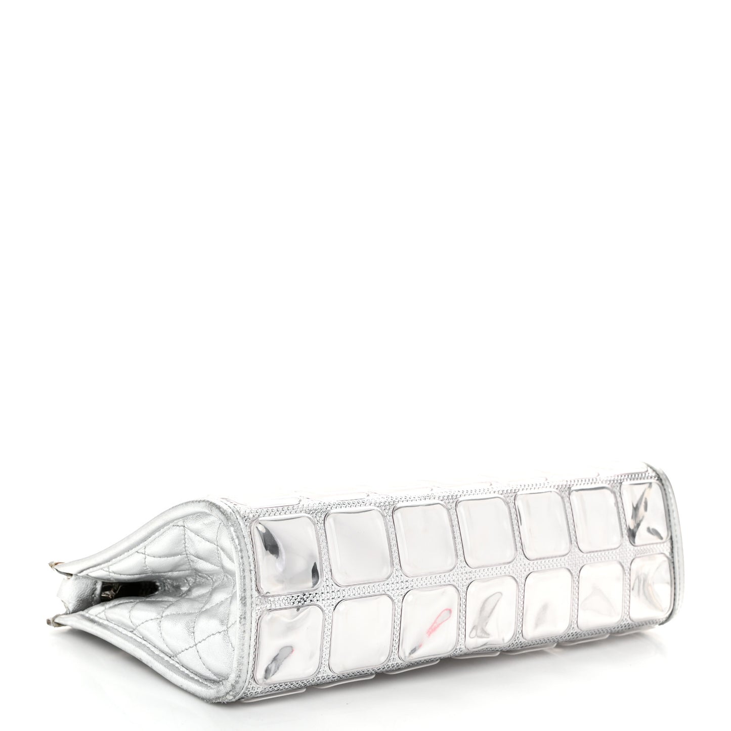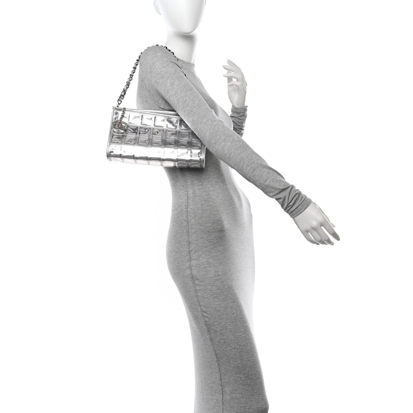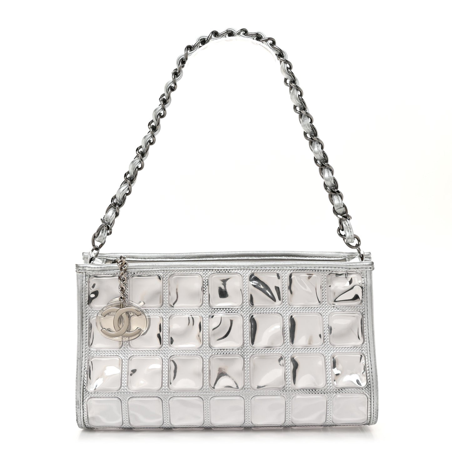 This is an authentic CHANEL Vinyl Ice Cube Pochette. This is made of clear vinyl "cubes" placed on metallic leather to resemble the iconic Chanel quilting, with diamond-shaped stitching on the metallic lambskin sides & base.The interior is dark gray satin fabric and features a patch pocket. The chains are silver-tone and the CC charm is covered in clear plastic.