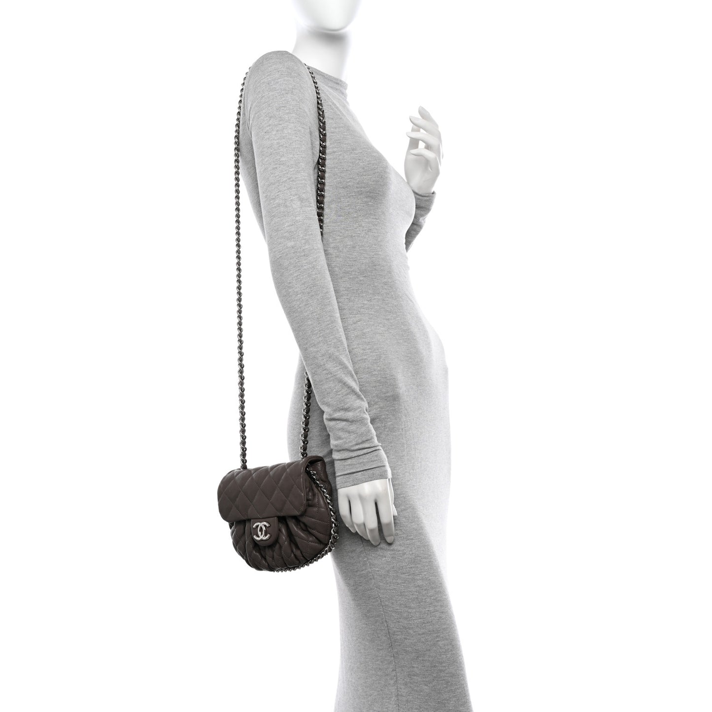 This is an authentic CHANEL Washed Lambskin Quilted Mini Chain Around Flap in Taupe. This chic messenger bag is crafted of luxurious diamond quilted and pleated padded lambskin leather in taupe. The bag features a leather threaded polished silver chain link crossbody strap and a silver Chanel CC that opens the front half flap with a magnet for quick access. The flap opens to a beige fabric interior with a zipper pocket.Follow this item for alerts. Chanel is a registered trademark of Chanel. FASHIONPHILE is not affiliated with Chanel.