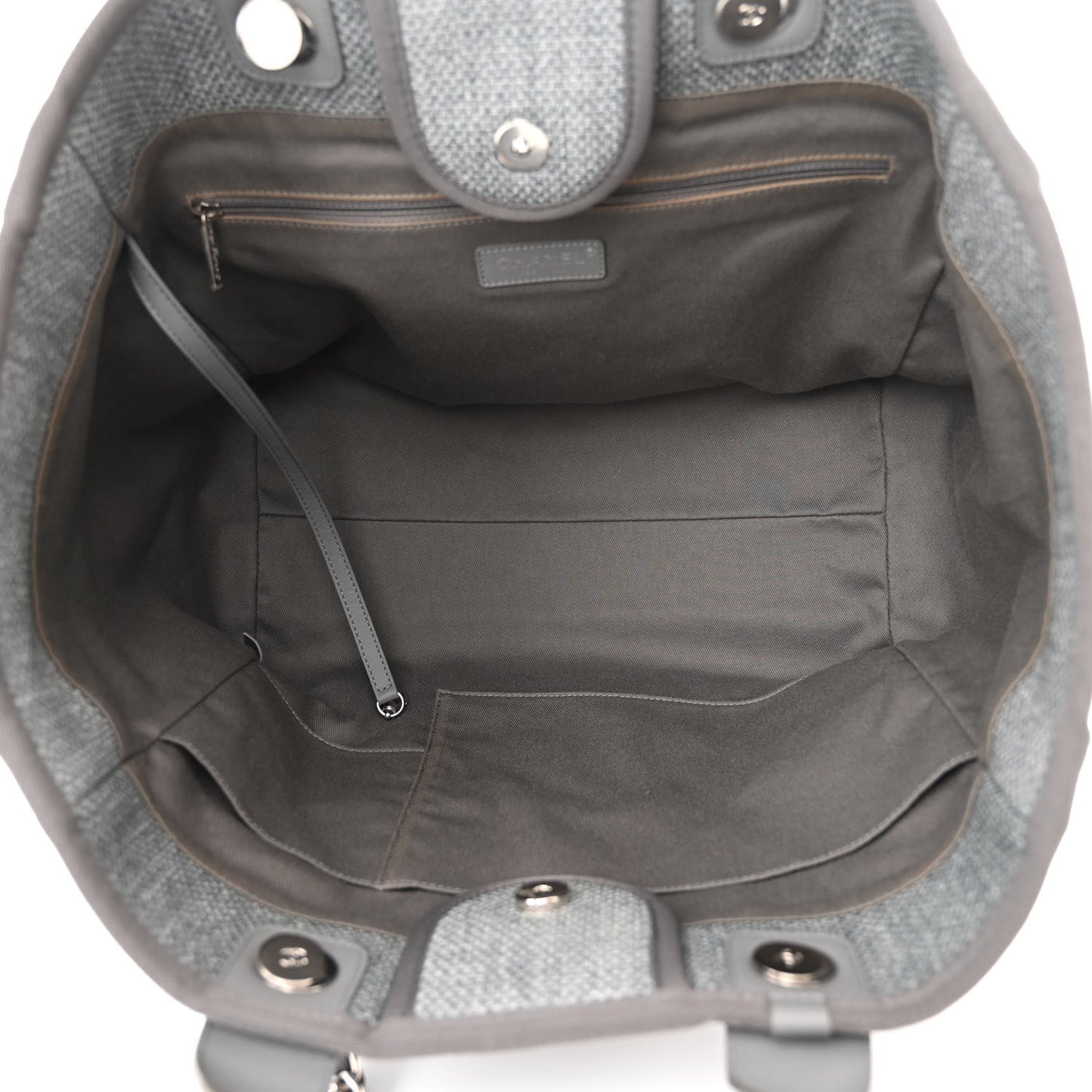 This is an authentic CHANEL Woven Straw Raffia Large Deauville Tote in Grey. This lovely woven light grey tote is crafted of fine raffia with an iconic Chanel logo in grey. The bag features canvas threaded silver chain shoulder straps, black leather top handles, and black canvas trim.The open top leads to a black fabric interior features zipper and patch pockets.Follow this item for alerts. Chanel is a registered trademark of Chanel. FASHIONPHILE is not affiliated with Chanel.