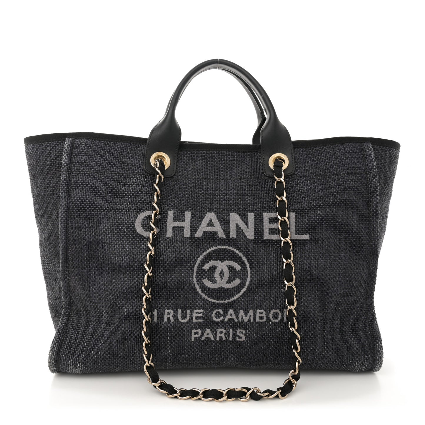This is an authentic CHANEL Woven Straw Raffia Medium Deauville Tote in Black. This stylish handbag is crafted of fine woven straw raffia in black with a grey embroidered Chanel Rue Cambon Paris logo on the front. The bag features black rolled leather top handles, black grosgrain fabric top trim, and fabric threaded gold chain shoulder straps. The top is open to a black fabric interior with zipper and patch pockets.Follow this item for alerts. Chanel is a registered trademark of Chanel. FASHIONPHILE is not affiliated with Chanel.