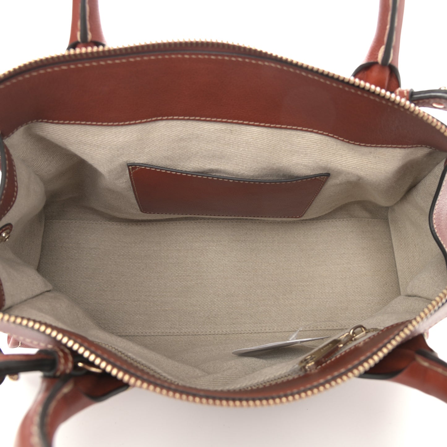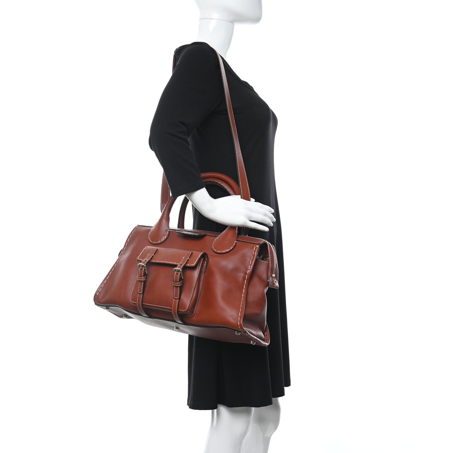 This is an authentic CHLOE Buffalo Medium Edith in Sepia Brown. This stylish satchel is finely crafted of soft brown leather. The bag features decorative white stitching, a front pocket, rolled leather handles, an optional shoulder strap, gold hardware, and a frontal pocket with belts. The top zipper opens to a beige fabric interior with zipper and patch pockets.Follow this item for alerts. Chloe is a registered trademark of Chloe. FASHIONPHILE is not affiliated with Chloe.