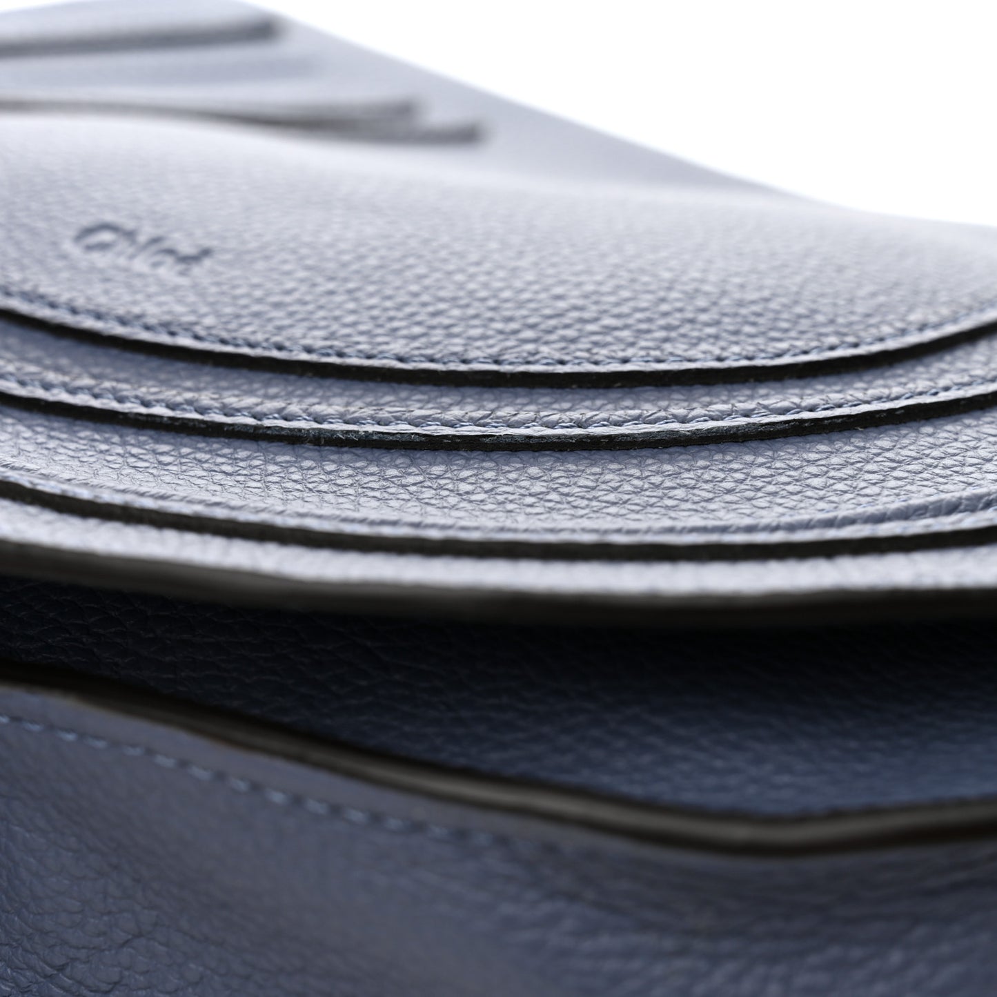 This is an authentic CHLOE Calfskin Medium Marcie Round Crossbody Bag in Street Blue. This stylish crossbody bag is crafted of textured blue calfskin leather, and features an adjustable leather shoulder strap with aged gold hardware. The crossover flap opens to reveal an inner pocket, and a beige fabric interior with a blue leather patch pocket.Follow this item for alerts. Chloe is a registered trademark of Chloe. FASHIONPHILE is not affiliated with Chloe.