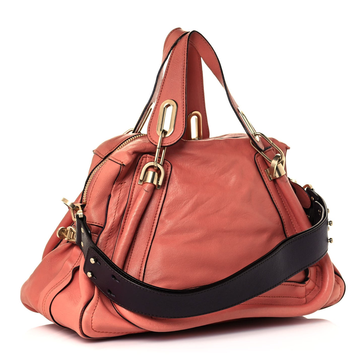 This is an authentic CHLOE Calfskin Medium Military Paraty in Peach Pink. This stylish tote is crafted of supple calfskin leather in peach pink. The bag features looping leather strap handles and an optional purple shoulder strap with extensive leather detailing and brass hardware. The top unzips to a beige fabric interior.Follow this item for alerts. Chloe is a registered trademark of Chloe. FASHIONPHILE is not affiliated with Chloe.
