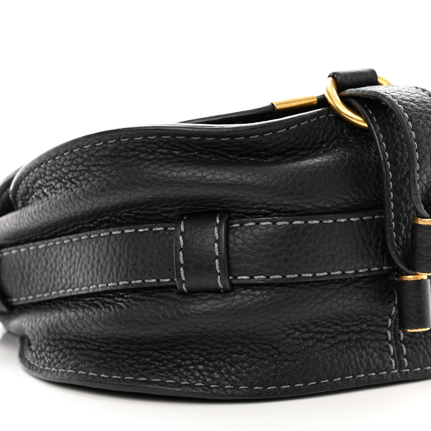 This is an authentic CHLOE Calfskin Mini Marcie Round Crossbody Bag in Black. This stylish crossbody bag is crafted of textured black calfskin leather. The bag features an adjustable leather shoulder strap with aged gold hardware. The crossover flap opens to reveal an inner pocket and a khaki green fabric interior with a pocket.Follow this item for alerts. Chloe is a registered trademark of Chloe. FASHIONPHILE is not affiliated with Chloe.