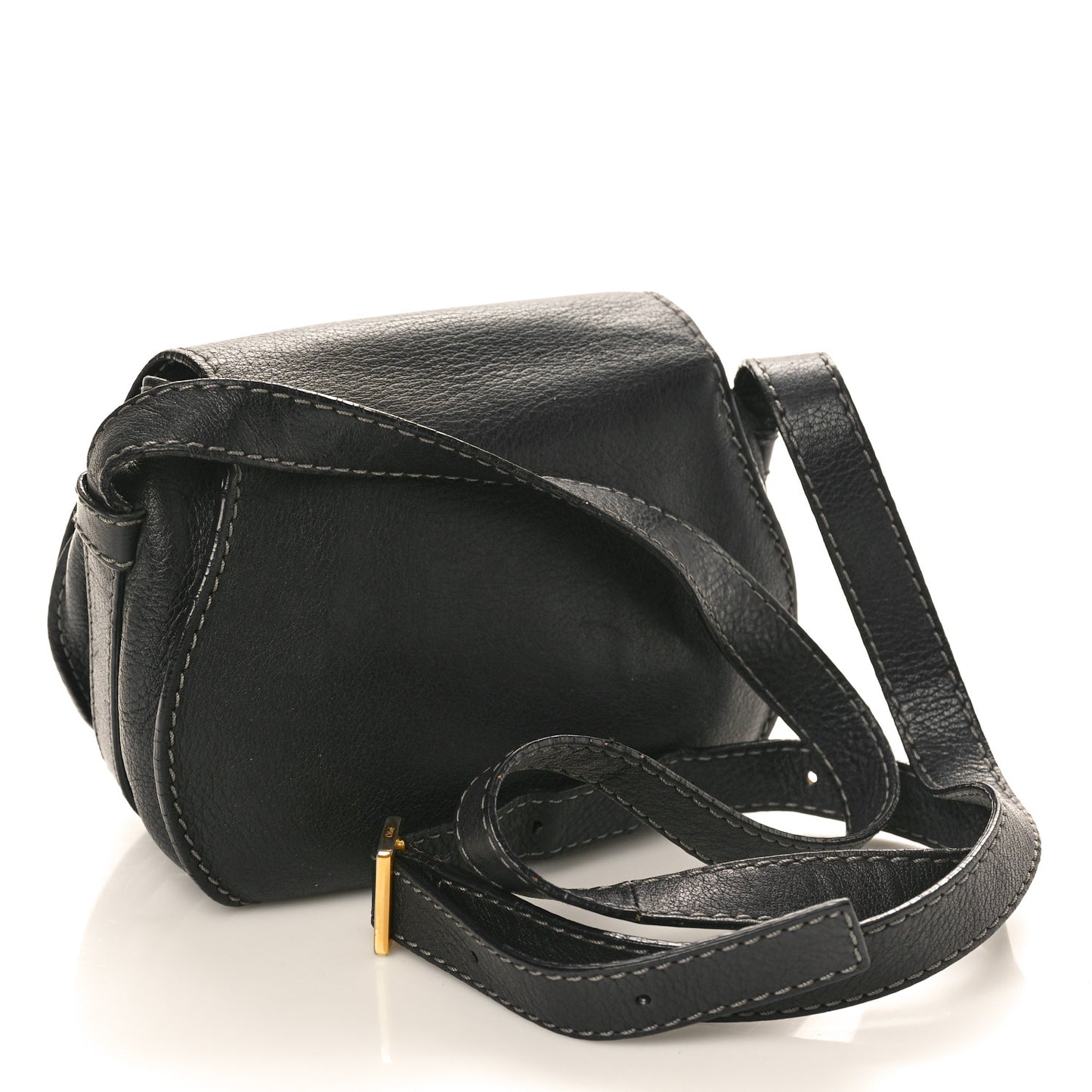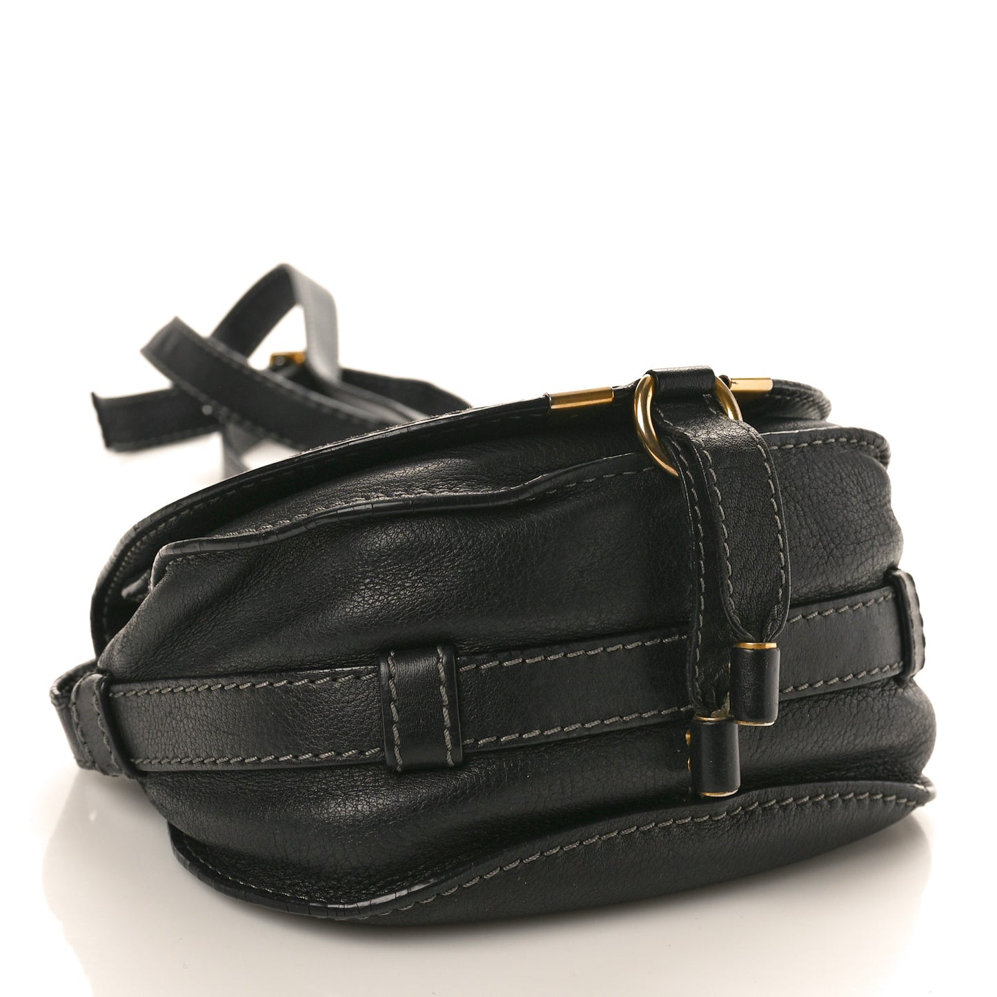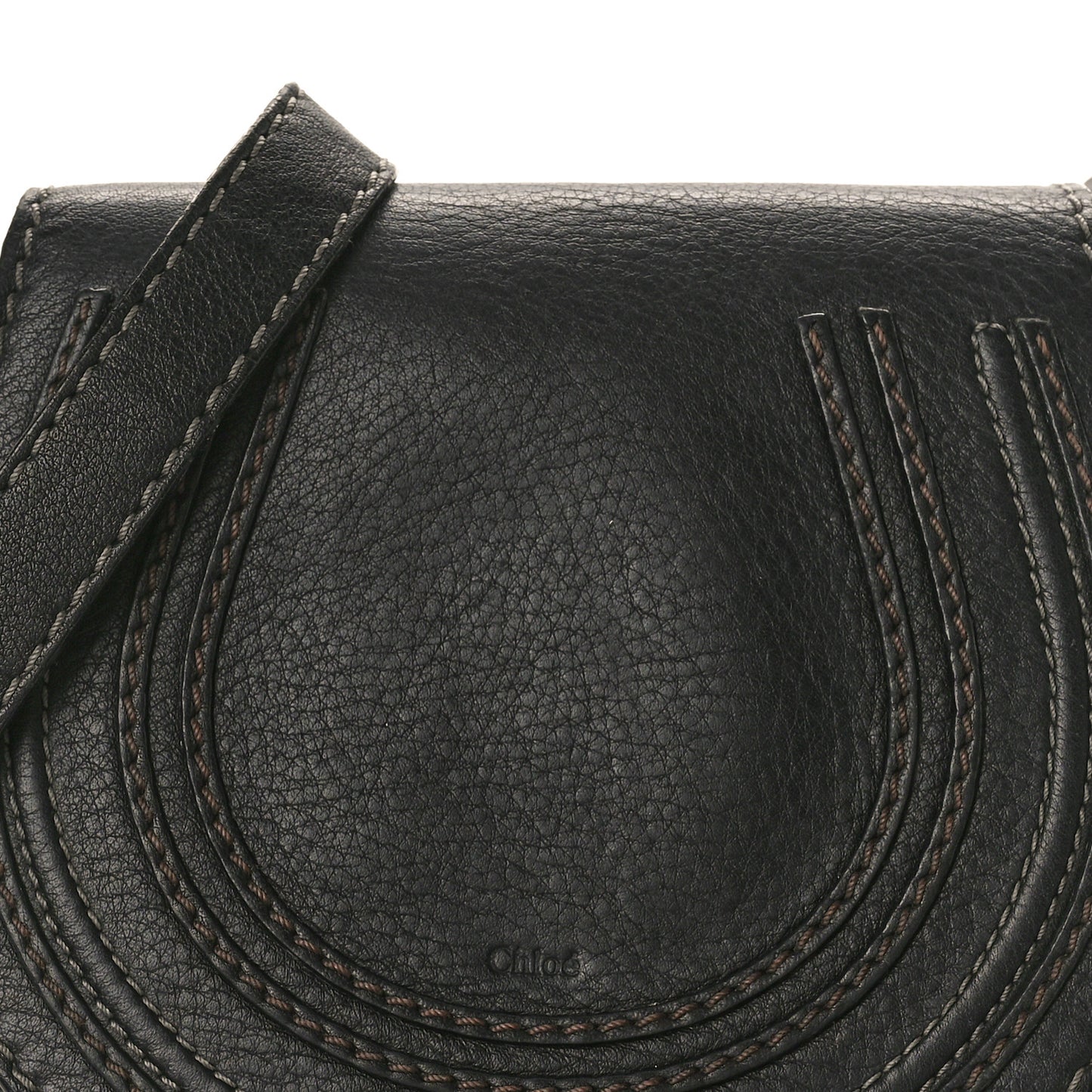 This is an authentic CHLOE Calfskin Mini Marcie Round Crossbody Bag in Black. This stylish crossbody bag is crafted of textured black calfskin leather. The bag features an adjustable leather shoulder strap with aged gold hardware. The crossover flap opens to reveal an inner pocket and a khaki green fabric interior with a pocket.Follow this item for alerts. Chloe is a registered trademark of Chloe. FASHIONPHILE is not affiliated with Chloe.