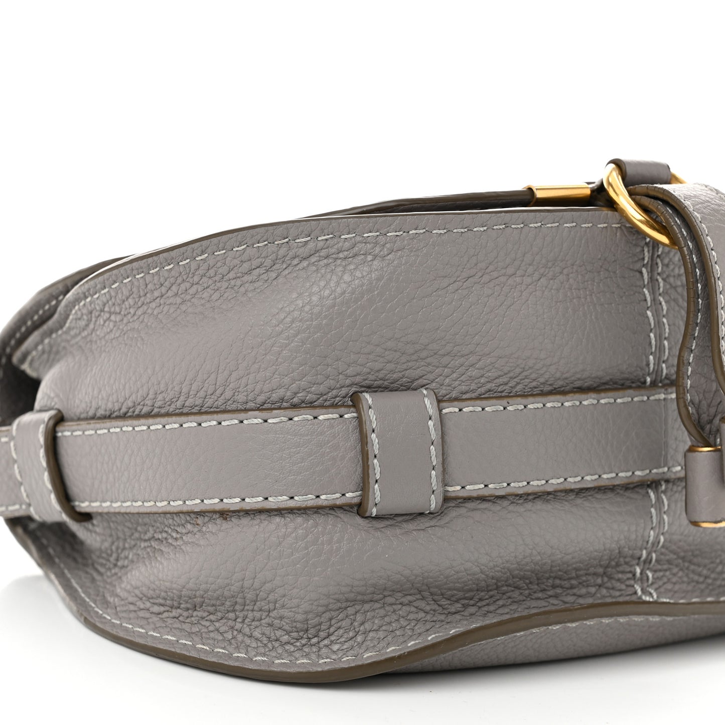 This is an authentic CHLOE Calfskin Mini Marcie Round Crossbody Bag in Cashmere Grey. This chic saddle bag is crafted of grained calfskin leather in grey. The bag features an adjustable leather crossbody strap with gold-plated hardware and a front flap with decorative stitching and strap-and-loop closure. This shoulder bag opens to a khaki green fabric interior with patch pockets.Follow this item for alerts. Chloe is a registered trademark of Chloe. FASHIONPHILE is not affiliated with Chloe.