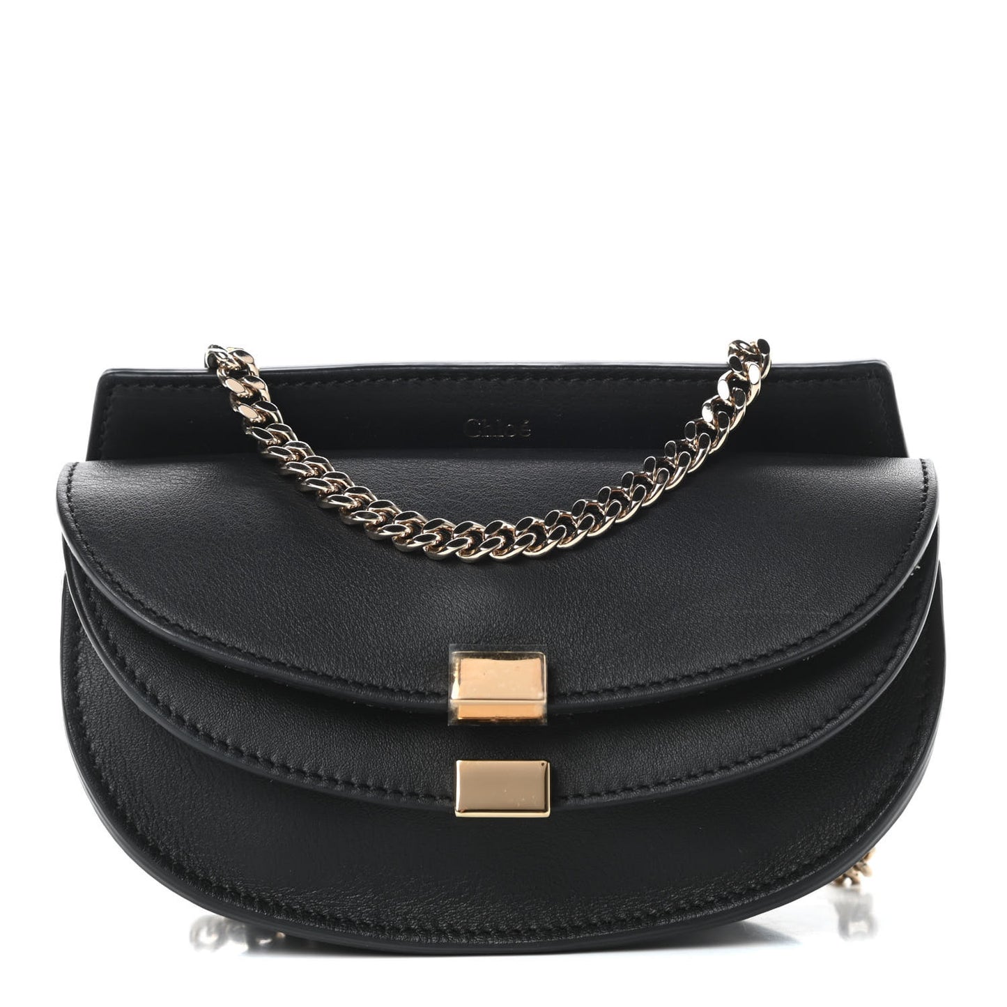 This is an authentic CHLOE Calfskin Nano Georgia Crossbody Bag in Black. This chic bag is crafted of luxuriously calfskin leather in black. The bag features a long polished gold chain shoulder strap and a double fold-over flap with magnetic button closures. This opens to a beige suede interior.Follow this item for alerts. Chloe is a registered trademark of Chloe. FASHIONPHILE is not affiliated with Chloe.