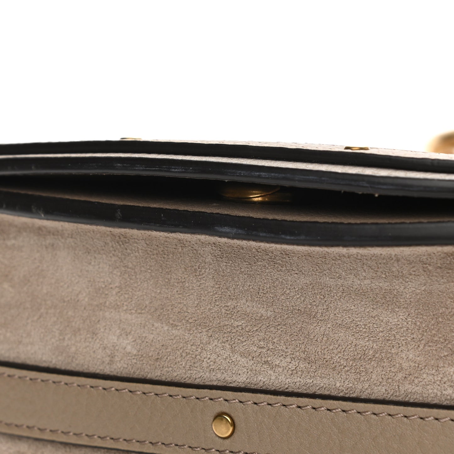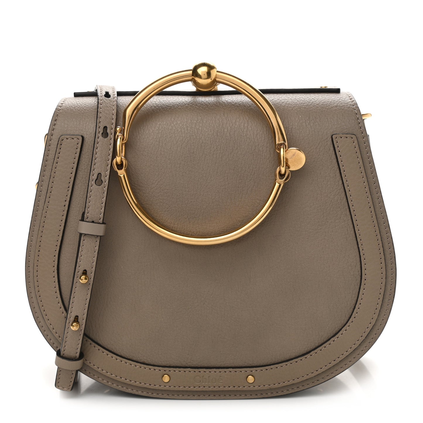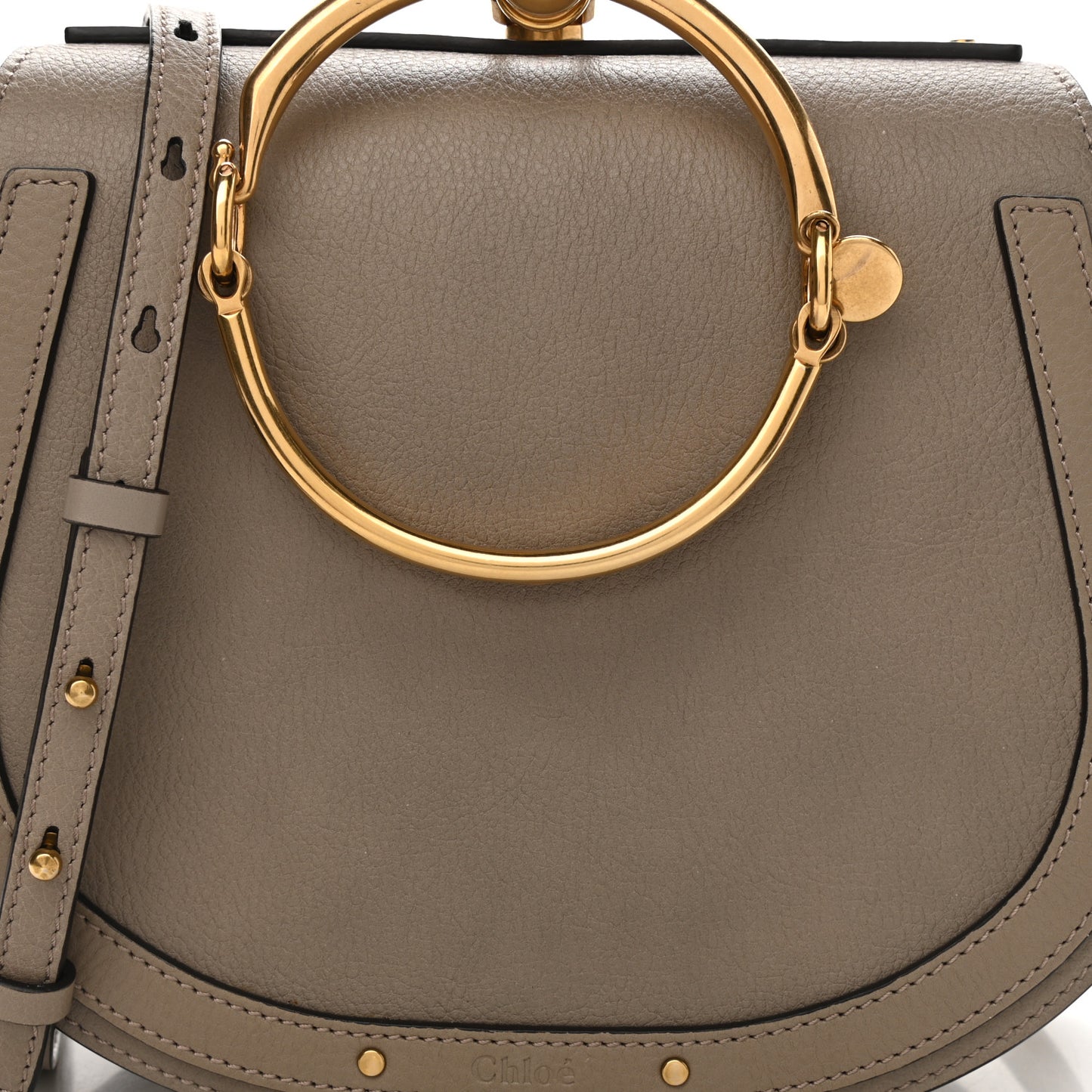 This is an authentic CHLOE Calfskin Suede Medium Nile Bracelet Bag in Motty Grey. This chic crossbody is crafted of fine calfskin leather in taupe. The bag has a polished gold loop handle, an optional leather shoulder strap, and gold hardware. The flap opens to a beige suede interior with a pocket.Follow this item for alerts. Chloe is a registered trademark of Chloe. FASHIONPHILE is not affiliated with Chloe.
