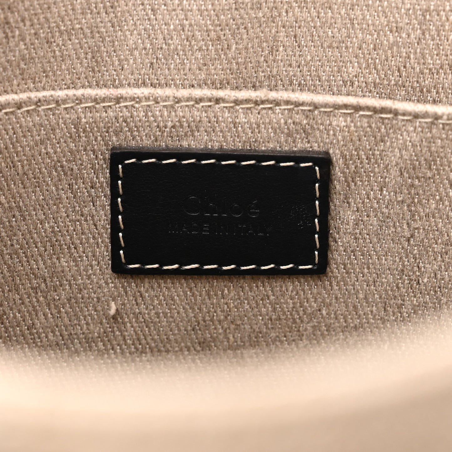 This is an authentic CHLOE Cotton Calfskin Medium Woody Ribbon Tote in Black and Blue. This chic tote is crafted of luxurious textured cotton canvas and smooth leather trim. The bag features Chloé logos set vertically on black canvas trim and smooth leather accents. The bag has an open top and a beige fabric interior with a patch pocket.Follow this item for alerts. Chloe is a registered trademark of Chloe. FASHIONPHILE is not affiliated with Chloe.