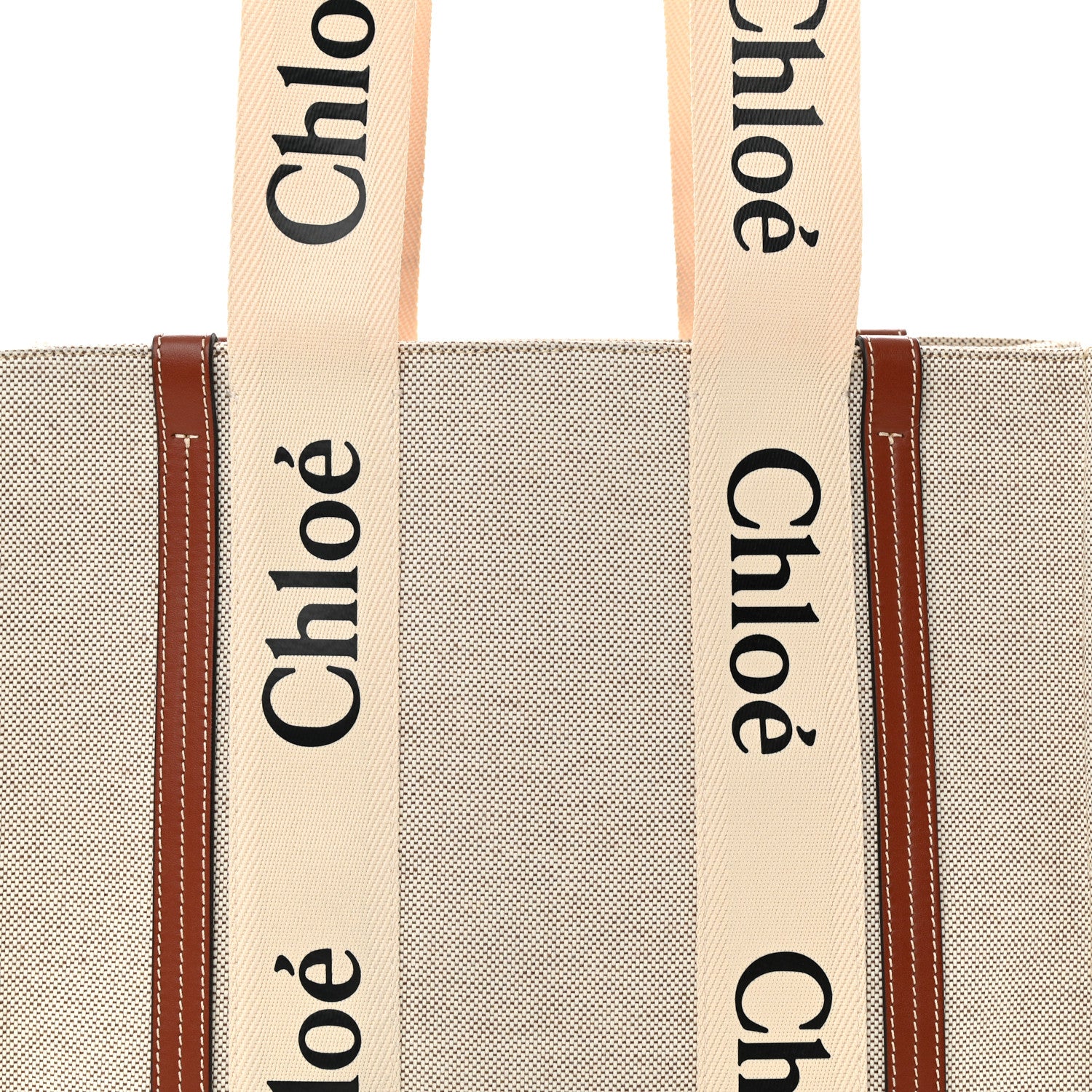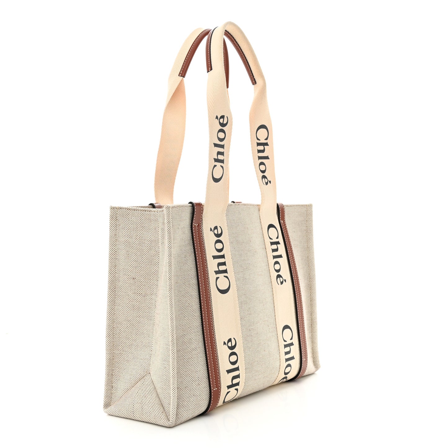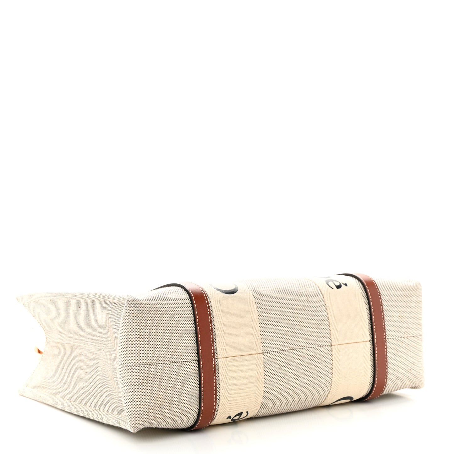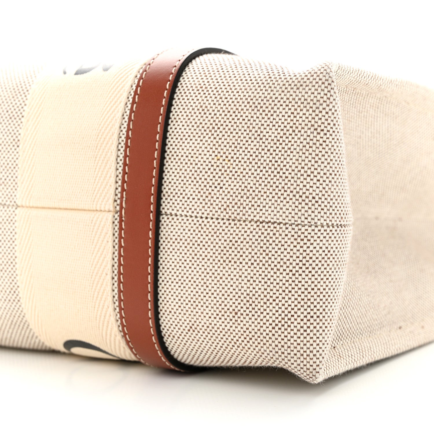 This is an authentic CHLOE Cotton Calfskin Medium Woody Ribbon Tote in White and Brown. This chic tote is crafted of brown calfskin leather and beige cotton canvas. The bag features black Chloé logos vertically on the white fabric trim that extent into the top handles with brown leather accents. The top is open to a matching fabric interior with a patch pocket.