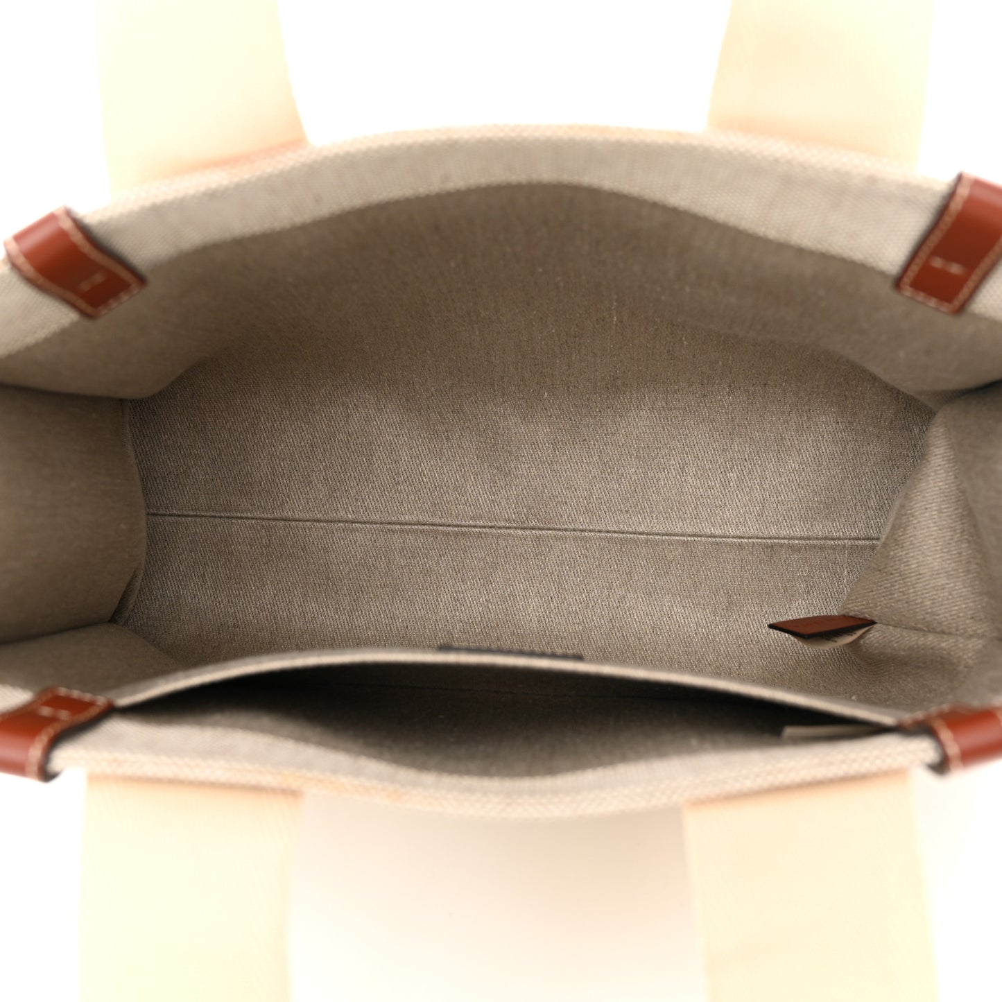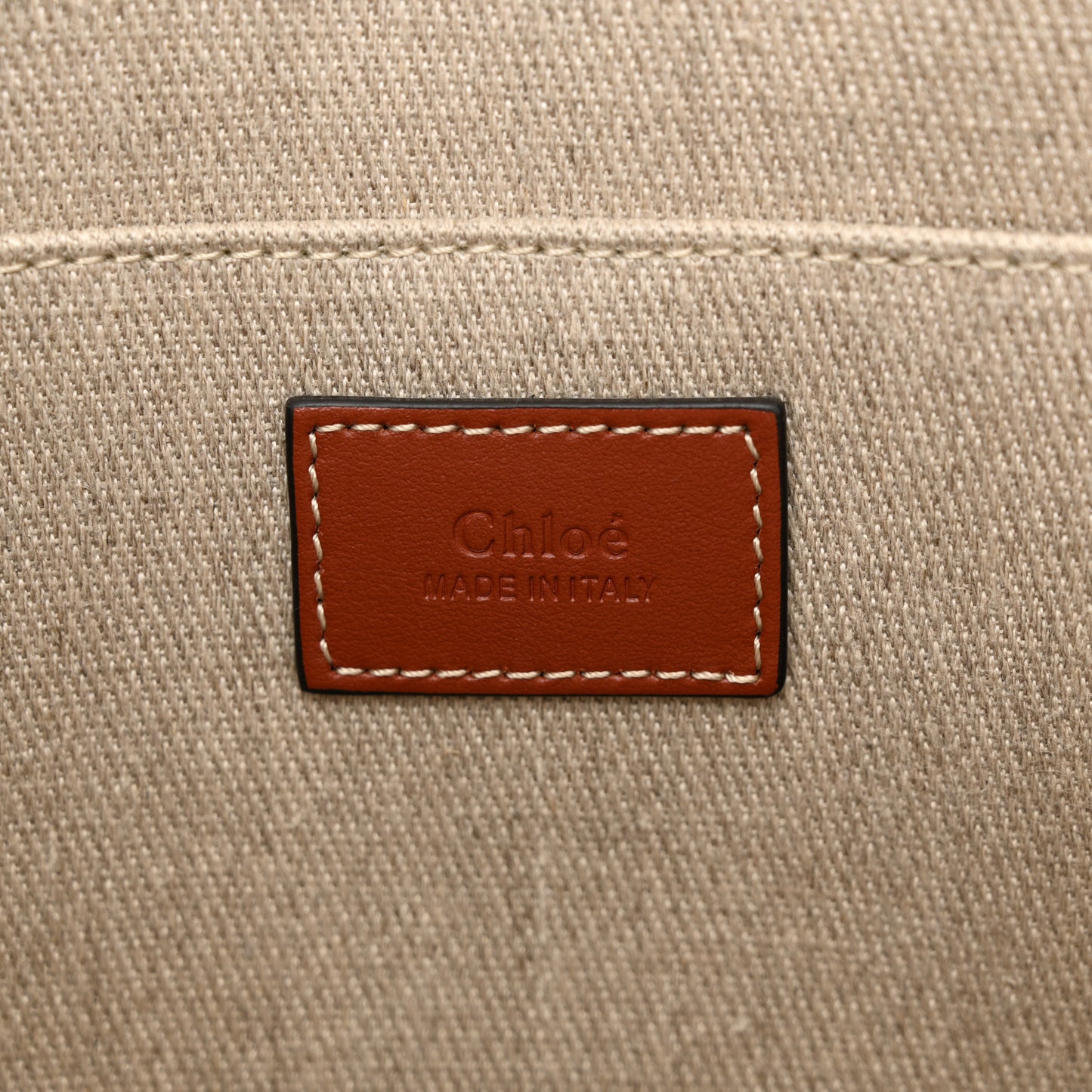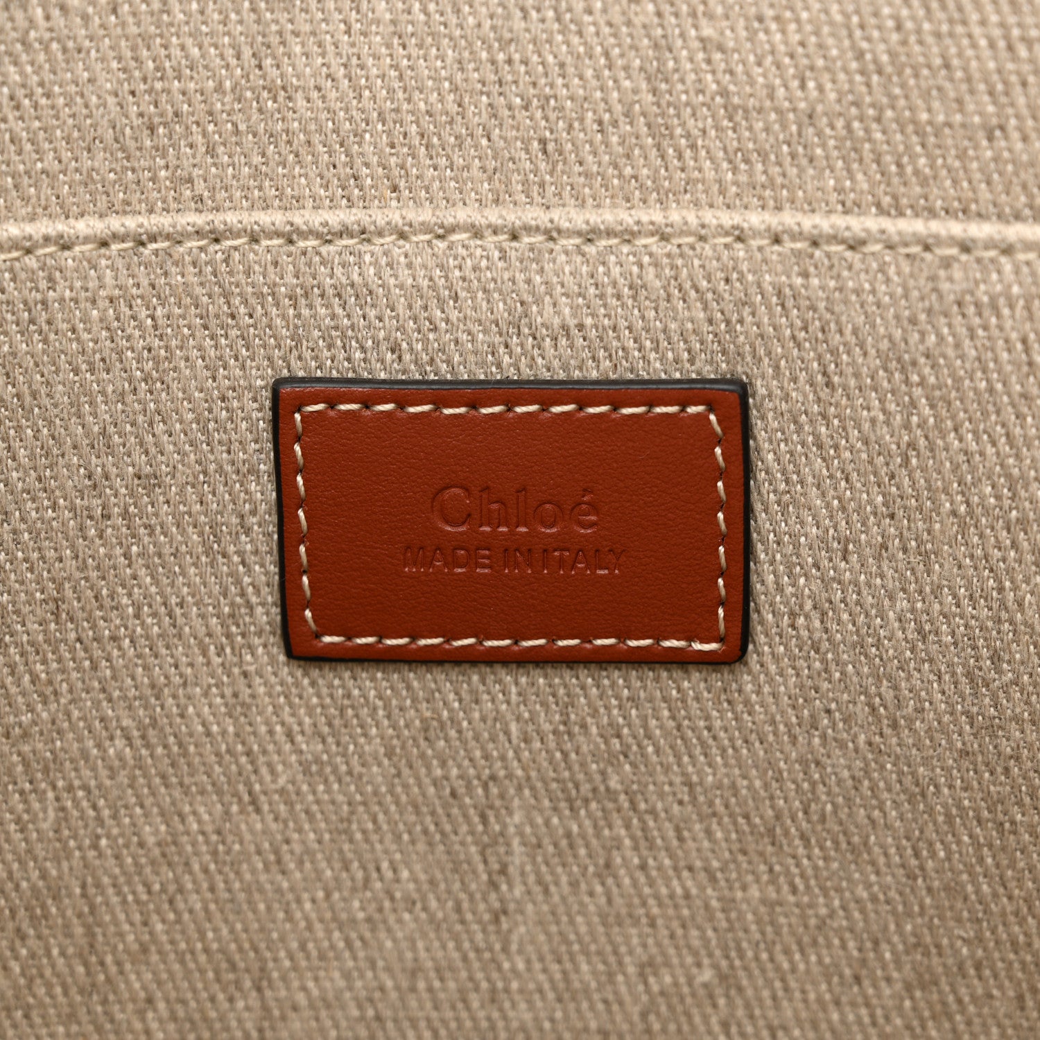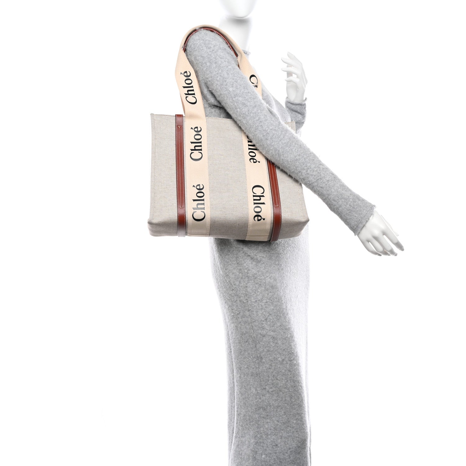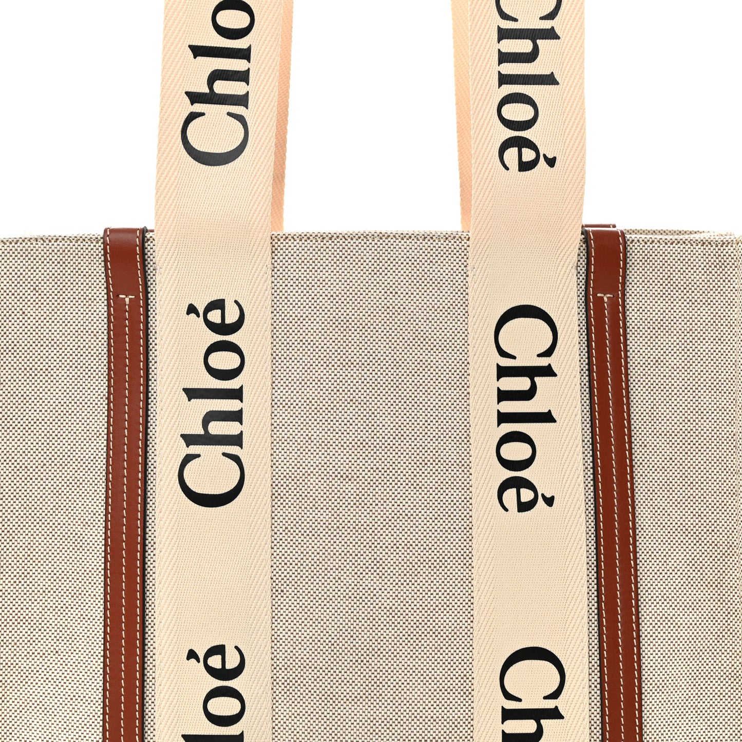 This is an authentic CHLOE Cotton Calfskin Medium Woody Ribbon Tote in White and Brown. This chic tote is crafted of brown calfskin leather and beige cotton canvas. The bag features black Chloé logos vertically on the white fabric trim that extent into the top handles with brown leather accents. The top is open to a matching fabric interior with a patch pocket.