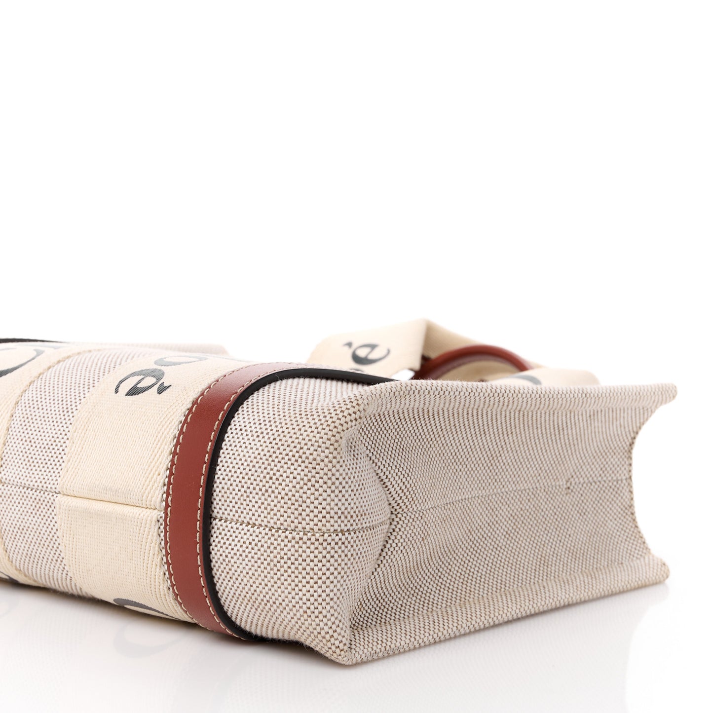 This is an authentic CHLOE Cotton Calfskin Small Woody Ribbon Tote With Strap in White and Brown. This chic tote is crafted of luxurious textured calfskin leather and beige cotton based. The bag features canvas handles with brown leather grips, an optional brown leather shoulder strap, and black Chloé logos vertically. The top is open to a beige fabric interior with a patch pocket.Follow this item for alerts. Chloe is a registered trademark of Chloe. FASHIONPHILE is not affiliated with Chloe.