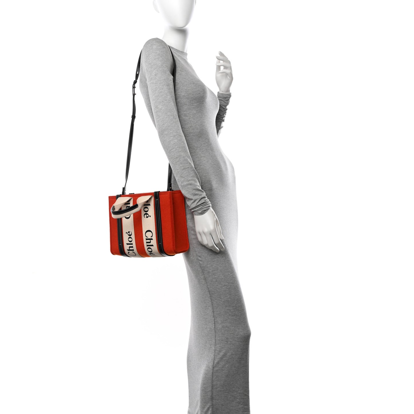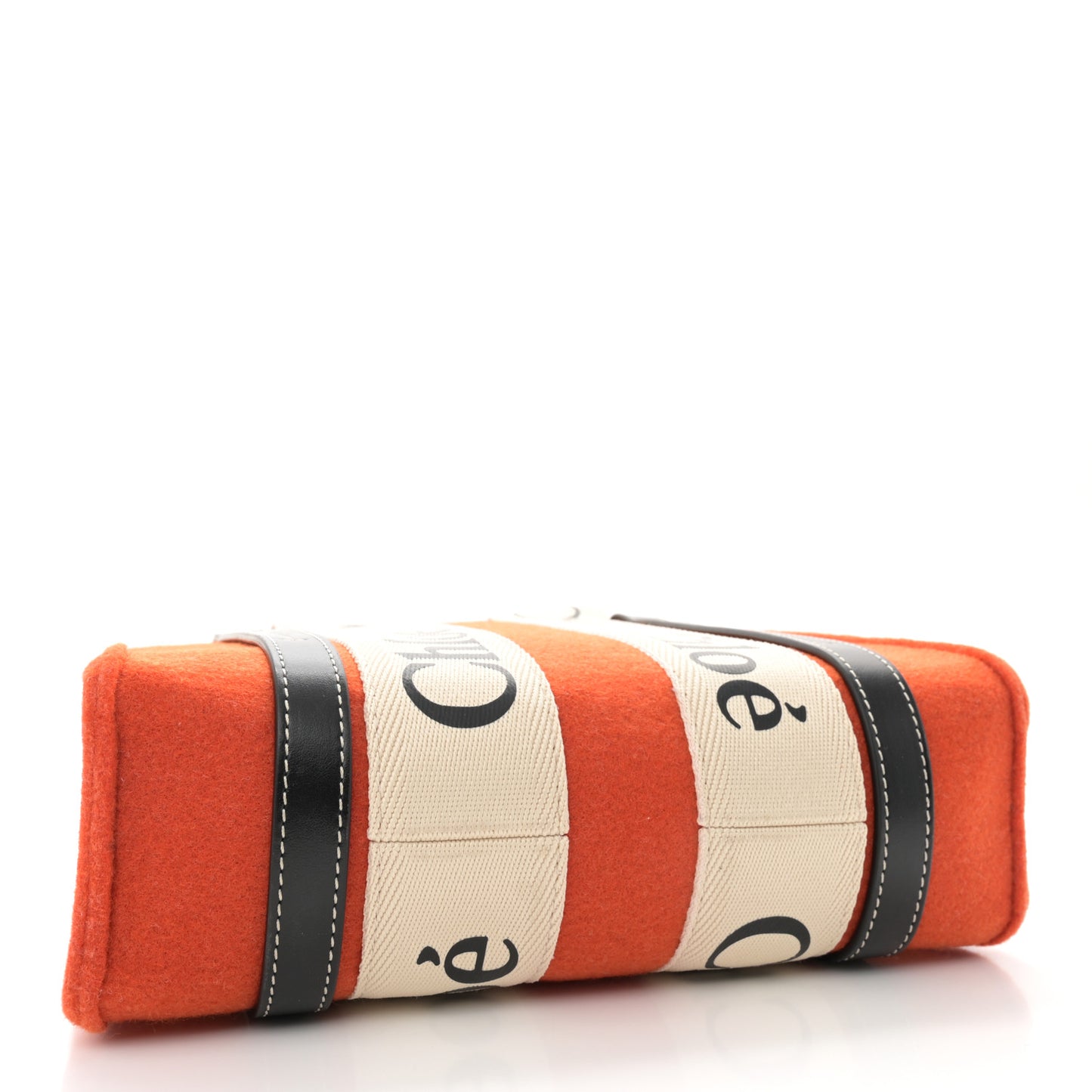 This is an authentic CHLOE Felt Calfskin Small Woody Ribbon Tote With Strap in Flame Orange. This stylish tote is crafted of orange felt, with black leather trim. It features canvas top handles and the top opens to an orange felt interior with a pocket.Follow this item for alerts. Chloe is a registered trademark of Chloe. FASHIONPHILE is not affiliated with Chloe.