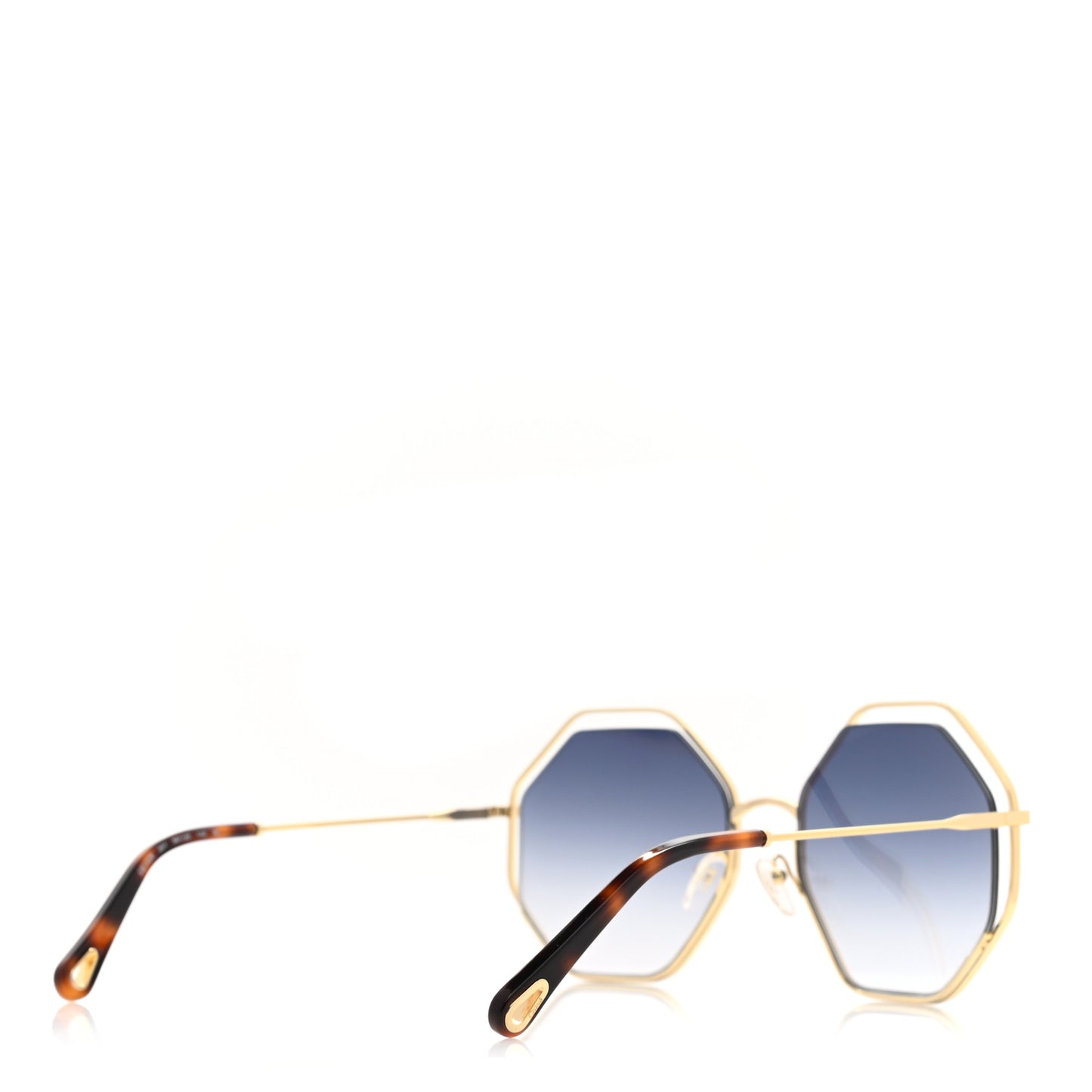 This is an authentic pair of CHLOE Octagonal Sunglasses CE132S in Havana Brown. These octagonal sunglasses have a wired brown frame with lenses in gradient blue. The arms are gold and narrow with tortoise ends.Follow this item for alerts. Chloe is a registered trademark of Chloe. FASHIONPHILE is not affiliated with Chloe.