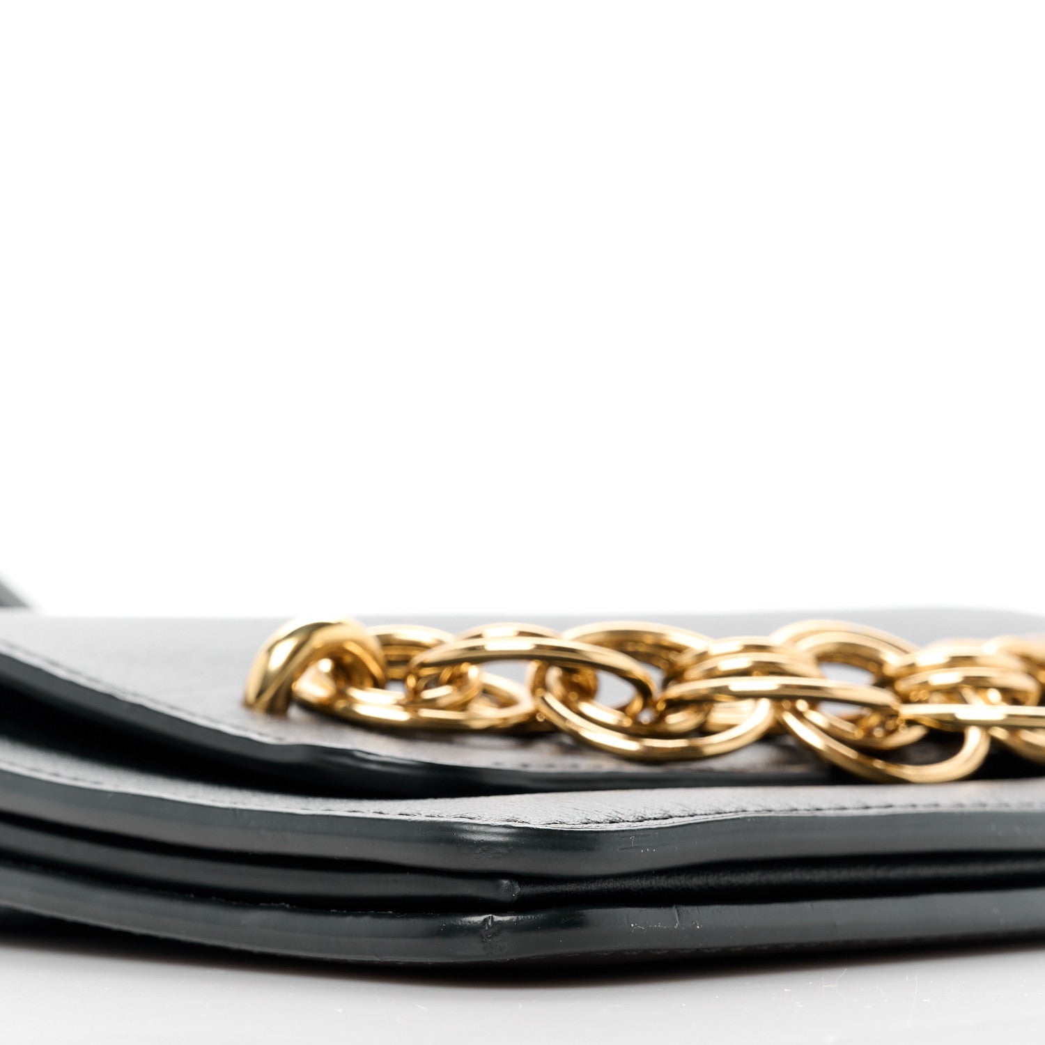 This is an authentic CHLOE Smooth Calfskin Drew Bijou Clutch in Black. This cluth is crafted of smooth calfskin leather in black with a decorative gold chain across the front flap. The bag features and a removable leather shoulder strap with polished gold hardware. The flap opens to a beige suede interior with a hanging patch pocket.Follow this item for alerts. Chloe is a registered trademark of Chloe. FASHIONPHILE is not affiliated with Chloe.