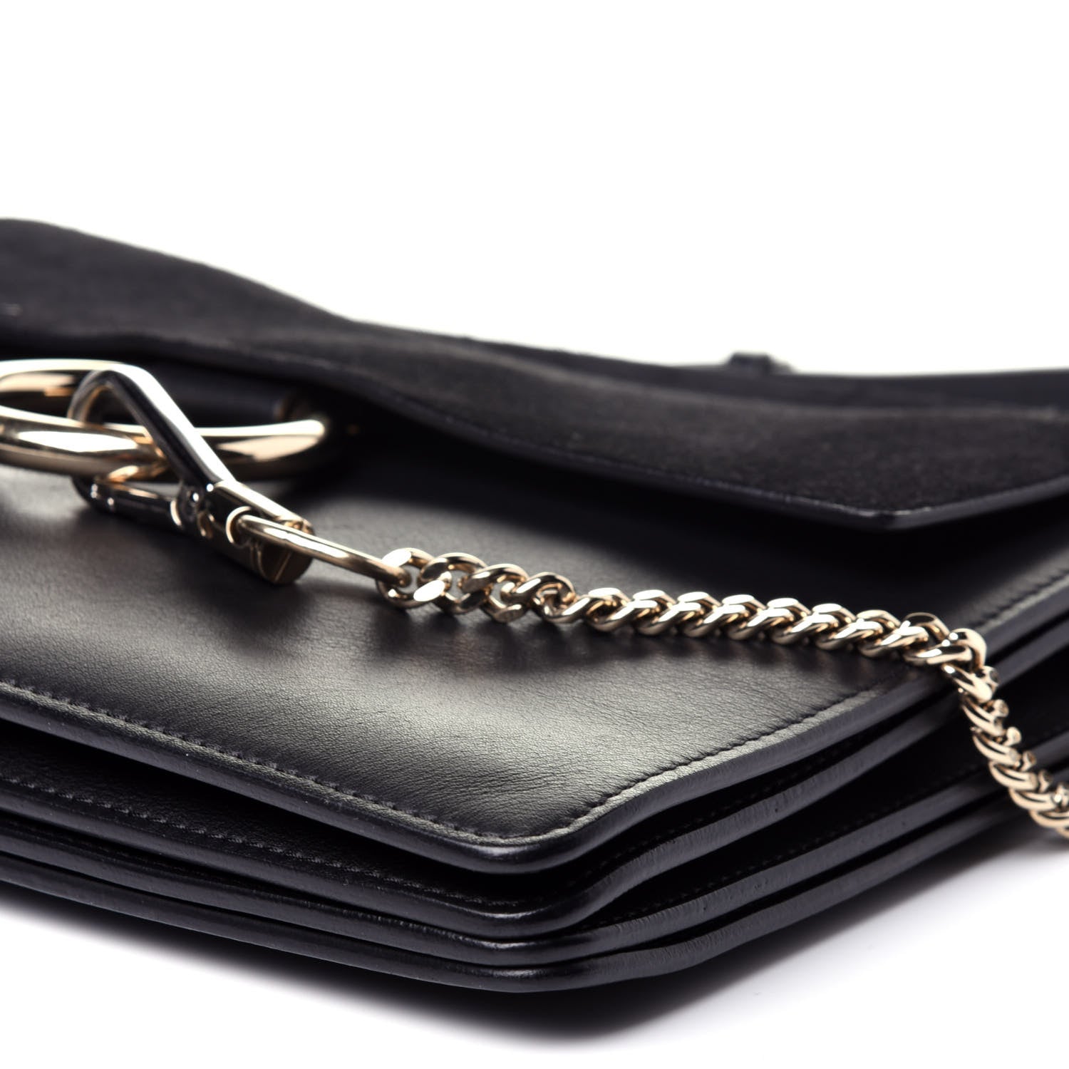 This is an authentic CHLOE Suede Calfskin Medium Faye Shoulder Bag in Black. This stylish handbag is crafted of finely grained calfskin leather in classic black. This bag features a leather shoulder strap, a suede leather flap and a decorative draping gold chain that clips to the gold ring closure. The flap opens to a divided interior in beige suede with a hanging zipper pocket.