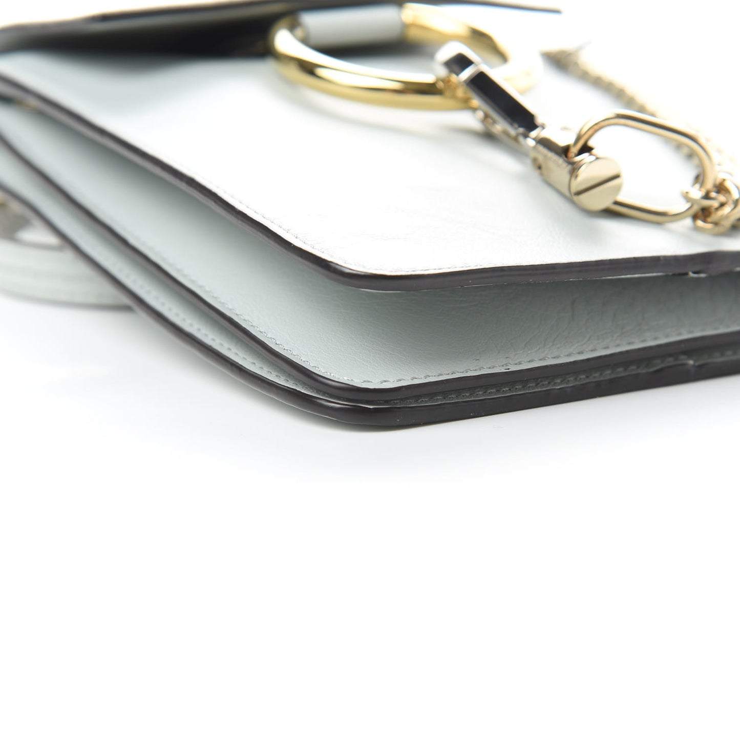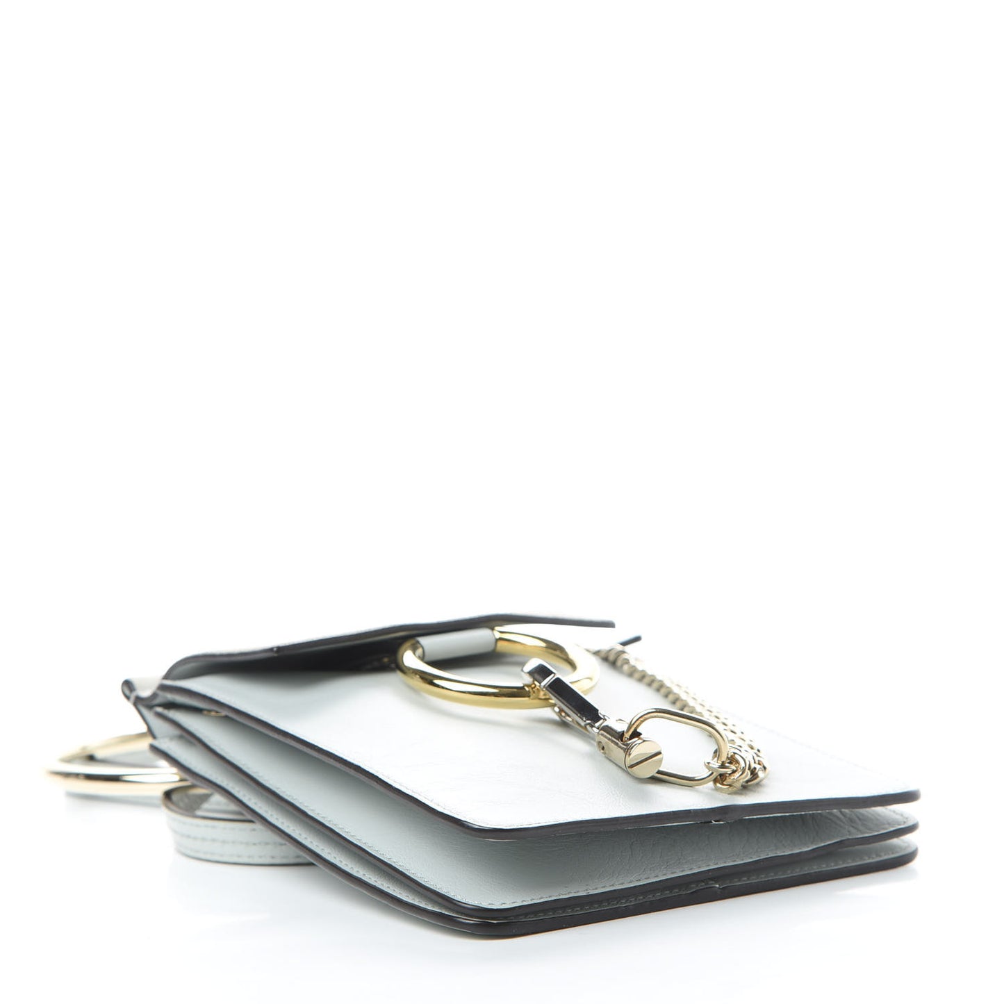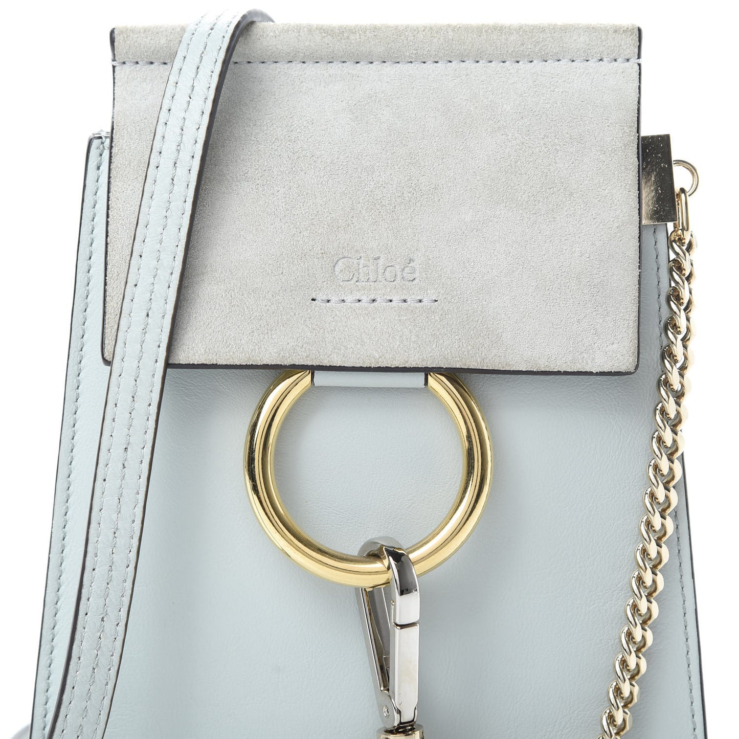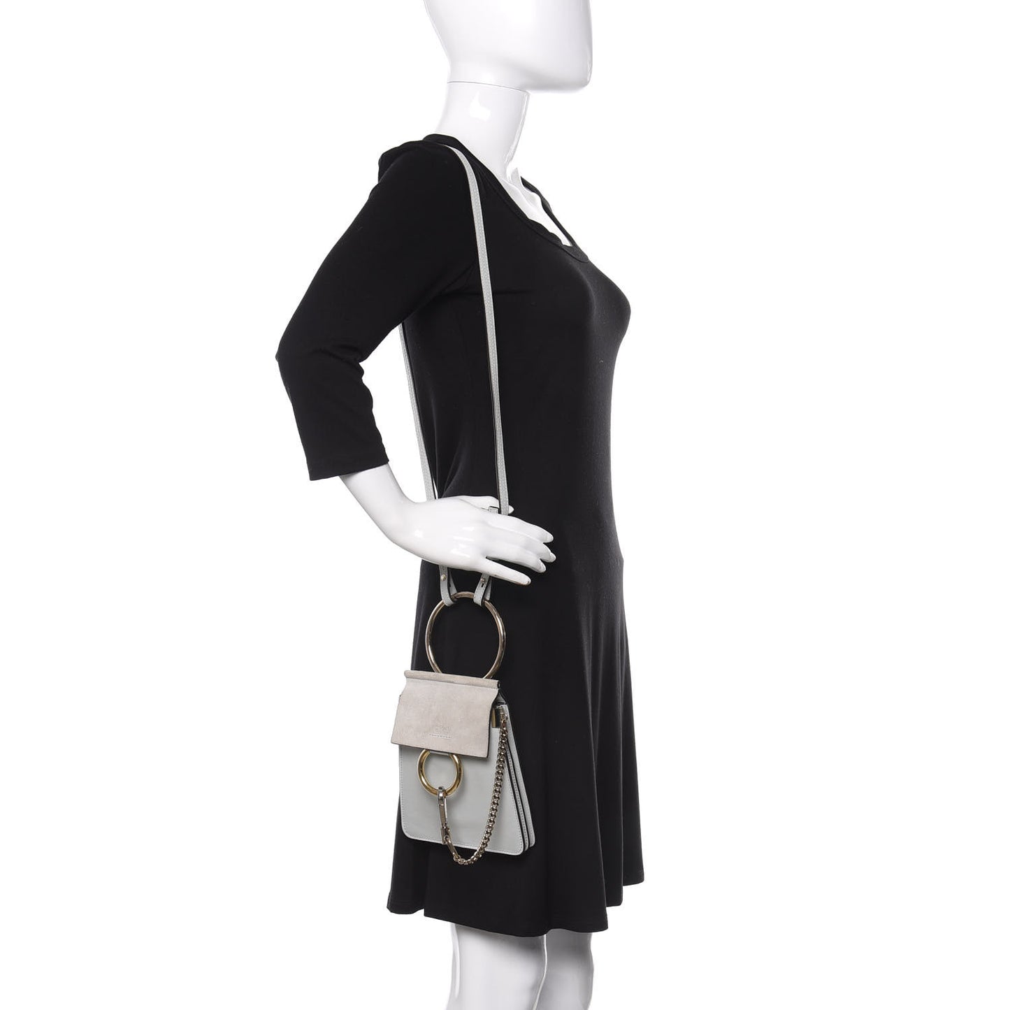 This is an authentic CHLOE Suede Calfskin Mini Faye Bracelet Bag in Airy Grey. This stylish mini handbag is crafted of fine smooth calfskin and suede leather in baby blue. This bag features polished silver and gold hardware including a decorative ring attached to a clasp and chain. The flap opens with a button snap to a cream interior with a patch pocket.Follow this item for alerts. Chloe is a registered trademark of Chloe. FASHIONPHILE is not affiliated with Chloe.