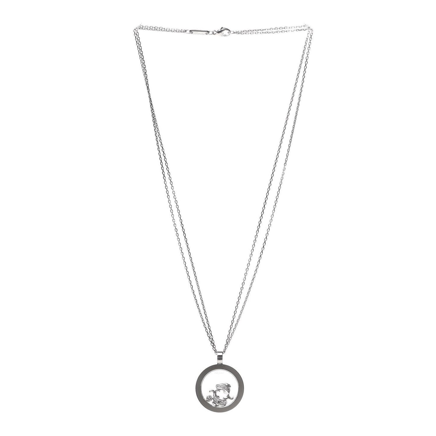 This is an authentic CHOPARD 18K White Gold Diamond Happy Diamonds Dolphin Pendant Necklace. The necklace is crafted of 18 karat white gold and features a circular pendant containing dolphin motif charms accented with diamonds, approximately .21 total carat weight.Follow this item for alerts. Chopard is a registered trademark of Chopard. FASHIONPHILE is not affiliated with Chopard.