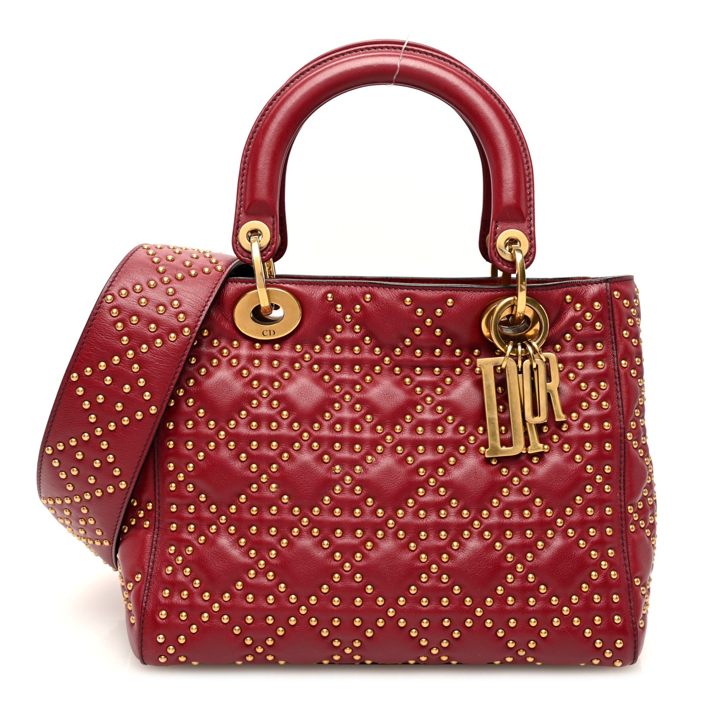 This is an authentic CHRISTIAN DIOR Calfskin Cannage Studded Medium Supple Lady Dior in Red. This tote is crafted of Cannage geometric studded jam red colored leather. The shoulder bag features gold tone mini studs, reinforced leather top handles with polished gold tone links, an optional leather shoulder strap with brass clasps and matching mini studs and a matching brass Dior charm. The matching top flap opens to a matching suede interior with zipper and patch pockets.Follow this item for alerts. Christian Dior is a registered trademark of Christian Dior. FASHIONPHILE is not affiliated with Christian Dior.