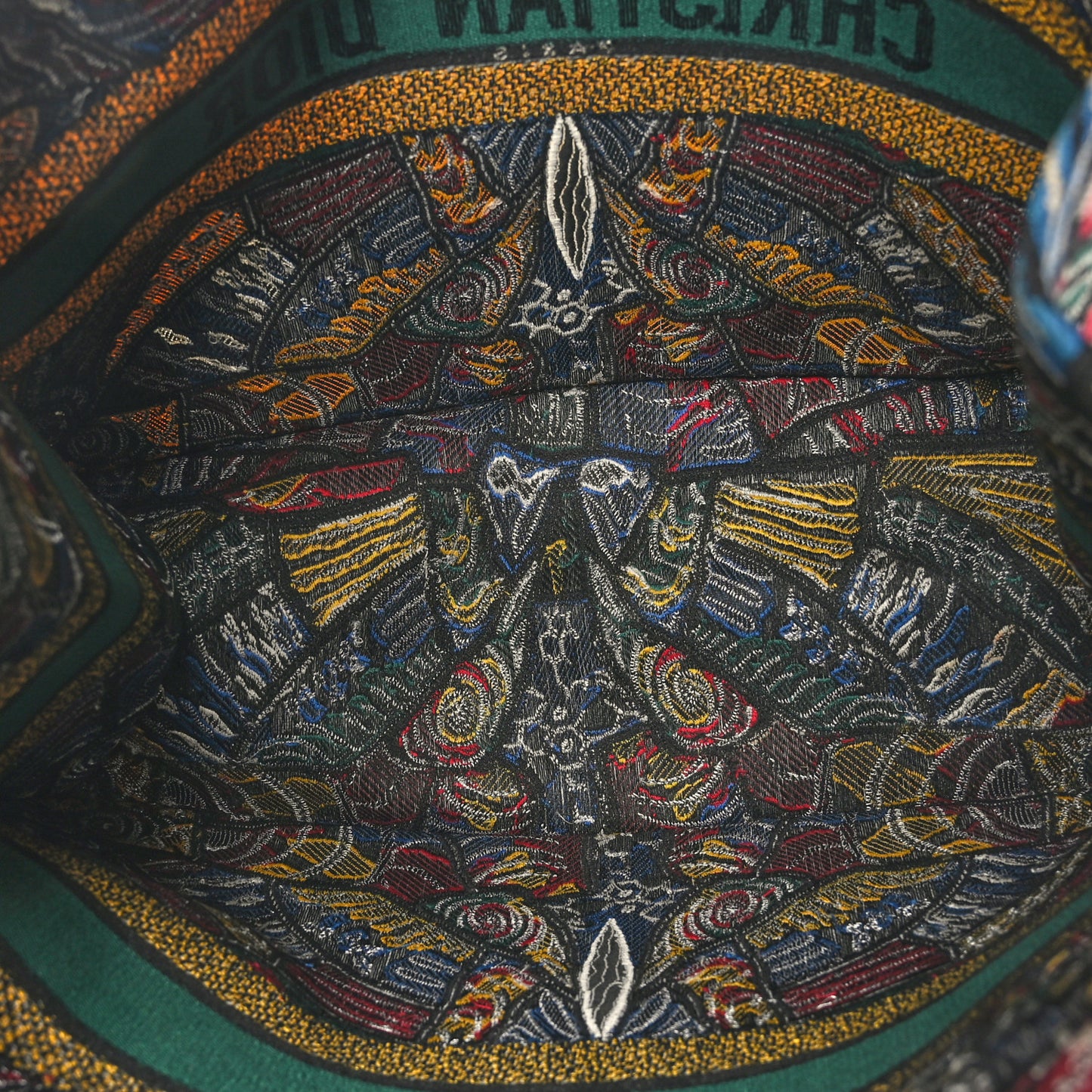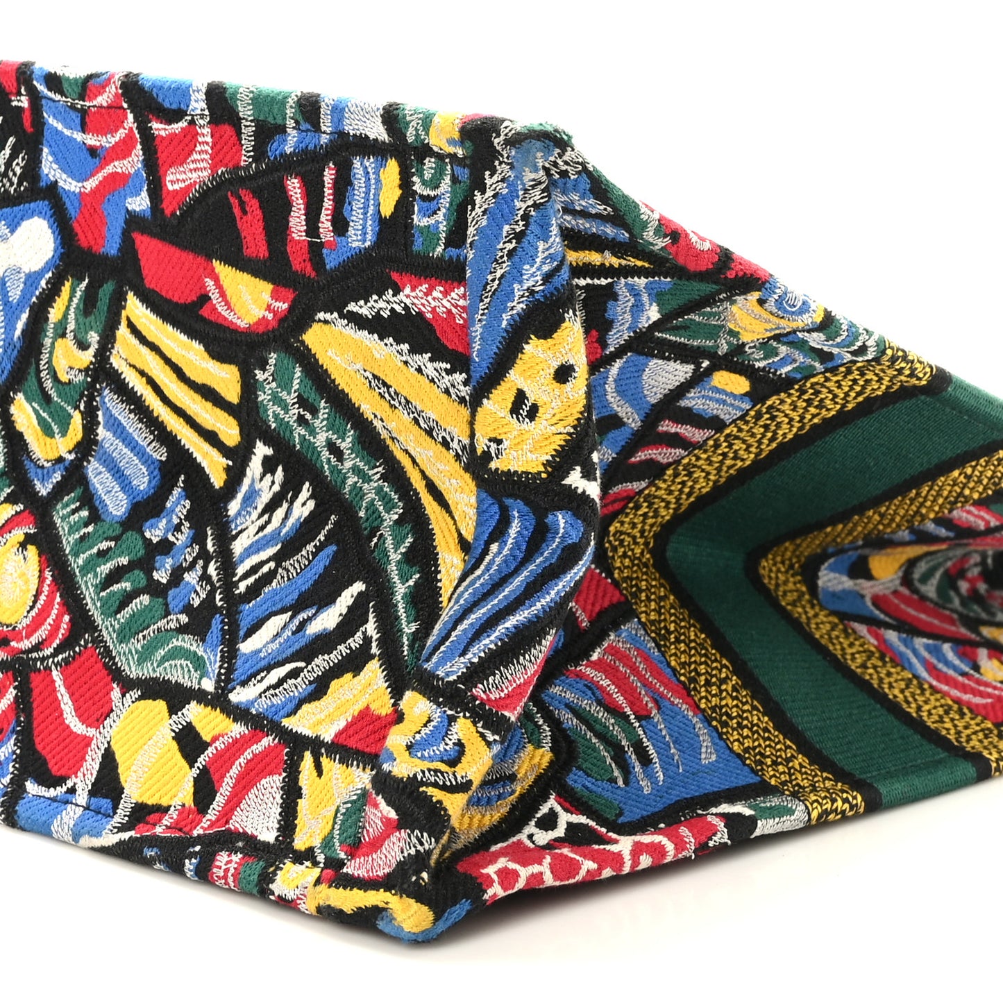 This is an authentic CHRISTIAN DIOR Canvas Embroidered Butterfly Book Tote in Black and Multicolor. This colorful tote is finely crafted of embroidered canvas with a bold intricate design. The bag features matching multicolor canvas rolled handles and the CHRISTIAN DIOR logo embroidered across the front.