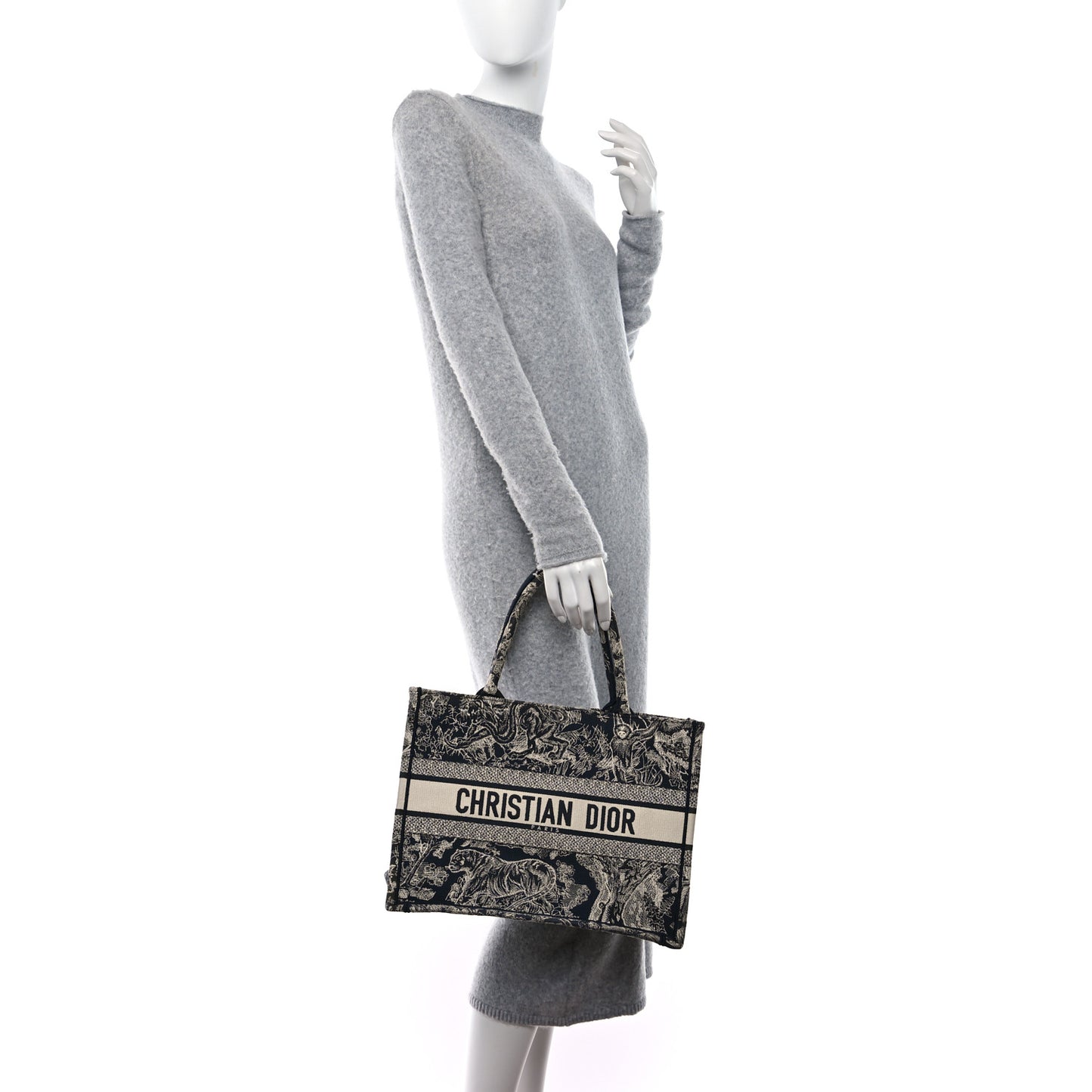 This is an authentic CHRISTIAN DIOR Canvas Embroidered Medium Toile De Jouy Reverse Book Tote in Blue. This stunning tote is finely crafted of embroidered canvas with a bold jungle graphic in blue and white. The bag features matching canvas rolled handles and a CHRISTIAN DIOR logo embroidered across the front. The bag opens to a spacious fabric interior.Follow this item for alerts. Christian Dior is a registered trademark of Christian Dior. FASHIONPHILE is not affiliated with Christian Dior.